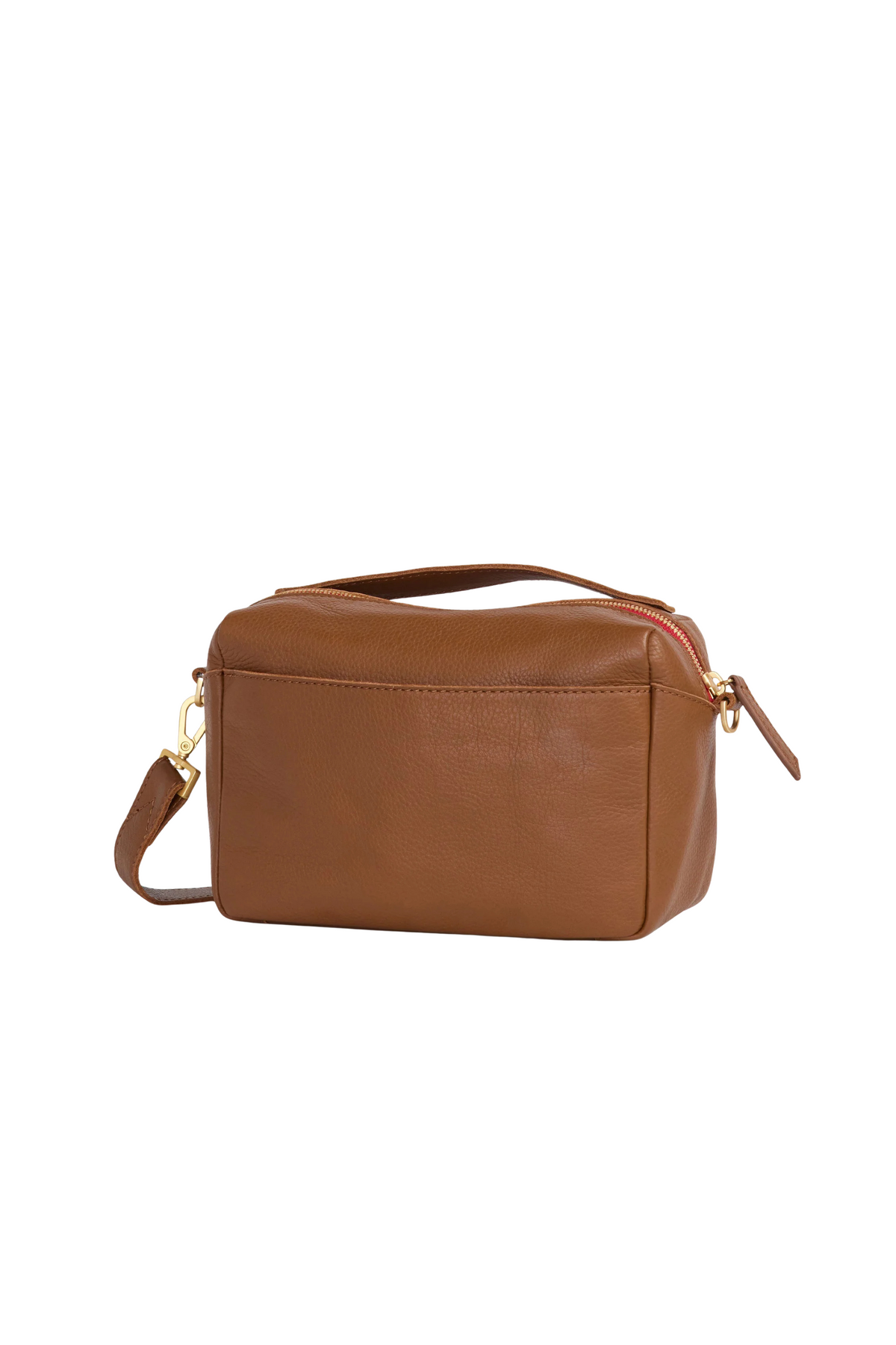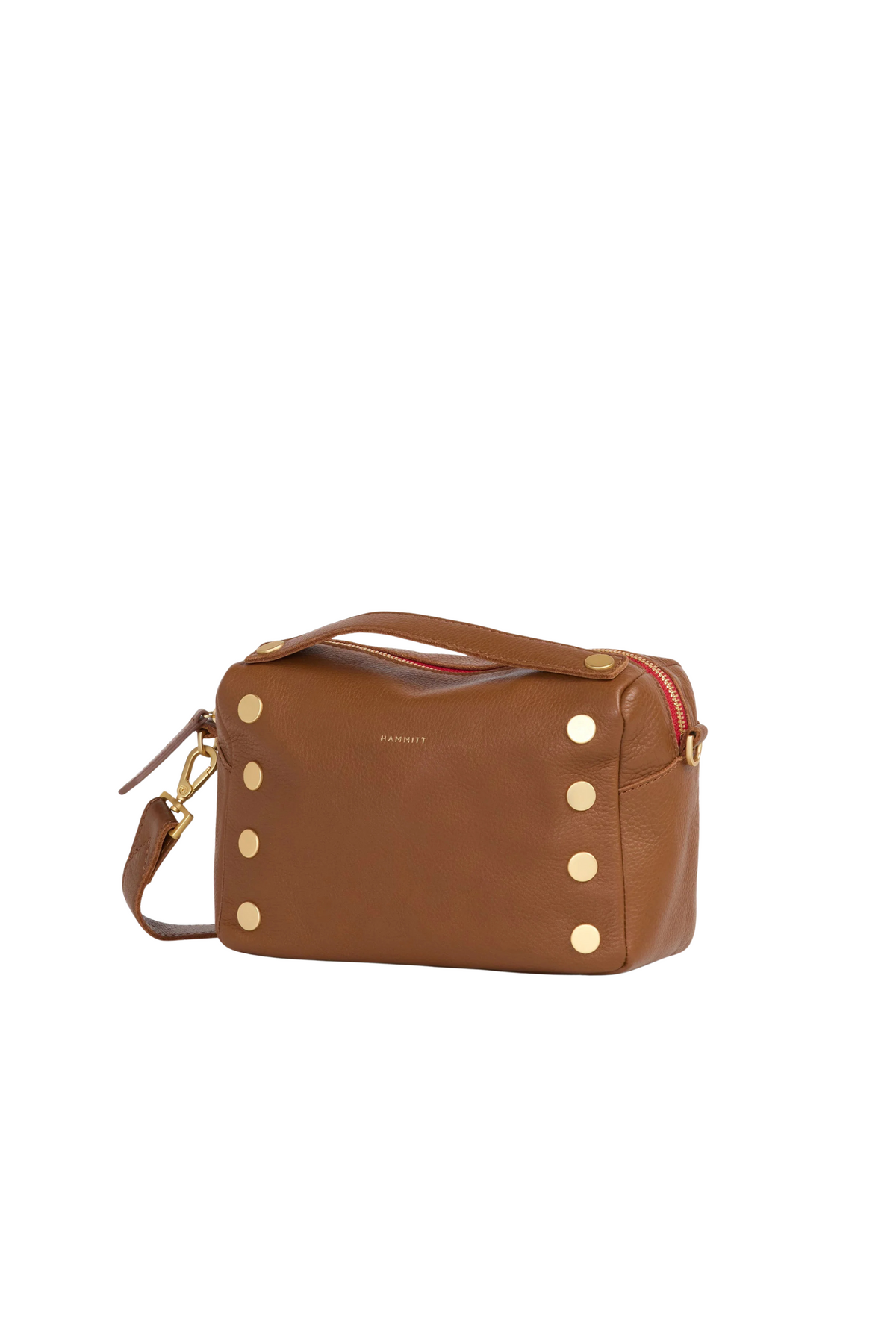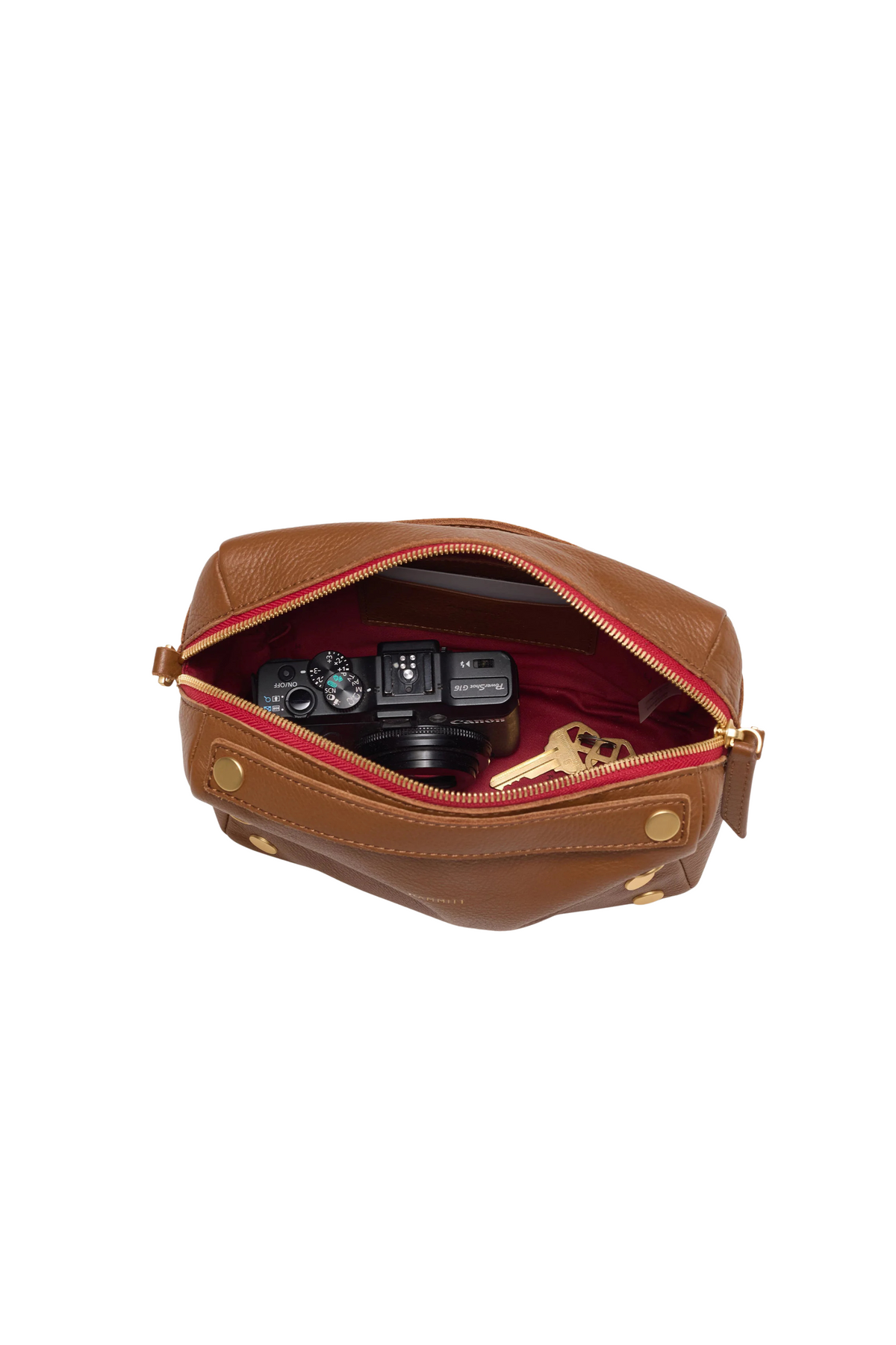 Specifically designed for customers who prefer a compact crossbody with a relaxed look, the Evan can be worn over the shoulder with a removable and adjustable crossbody strap. Or, carry it by its elevated top handle. This design pays homage to camera bags, with an East-West look. Featuring Hammitt's signature combo of black leather, brushed gold hardware and a statement red zipper.