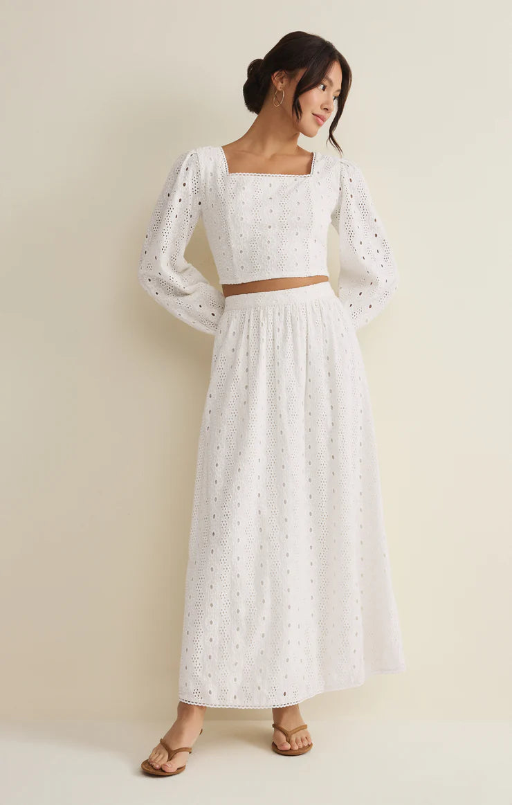 The perfect skirt does exist. This 100% cotton midi skirt features an elastic waistband, eyelet detail, and full lining.