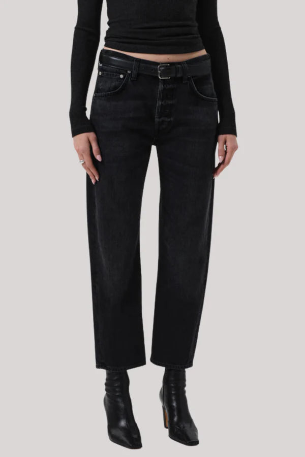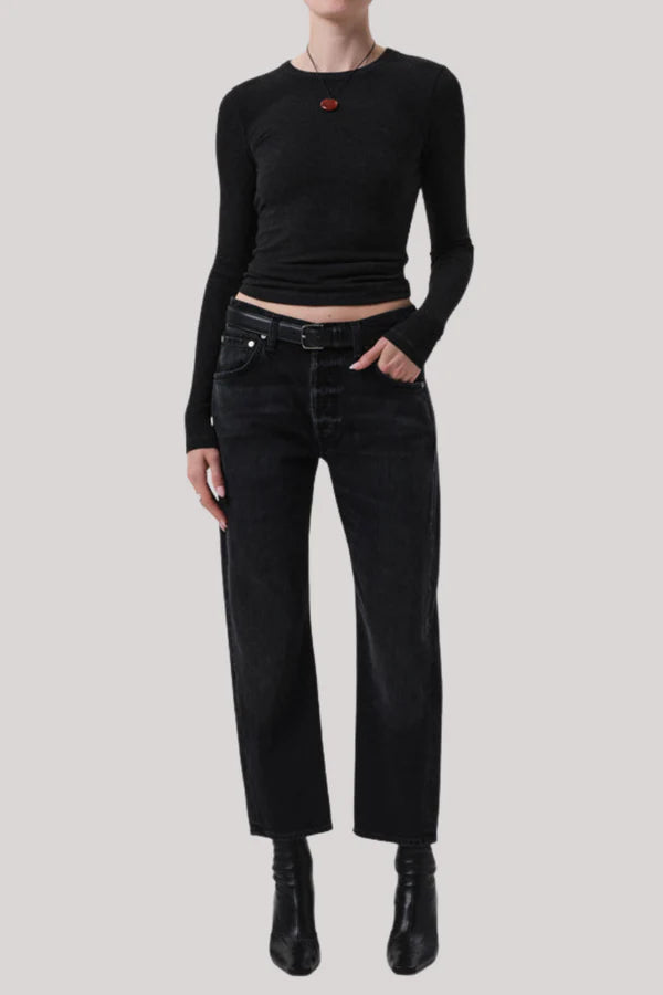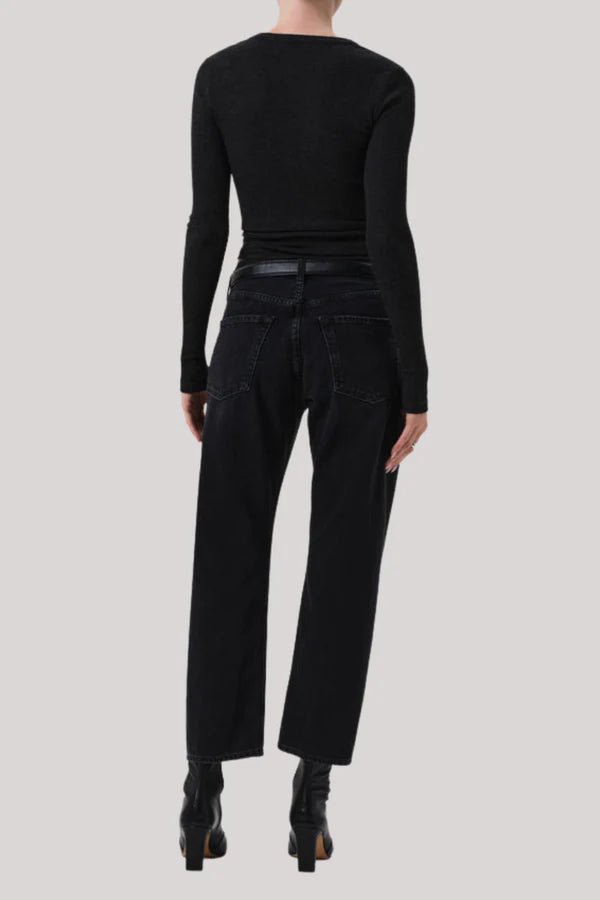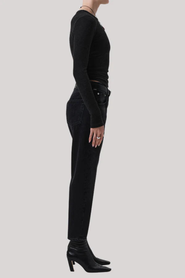 The Winslow is a modern take on the boyfriend jean, designed with a low rise and a relaxed fit through the leg. Crafted from rigid regenerative cotton with a soft hand, it holds its shape while offering an easy drape. Raine’s washed black denim gives the silhouette a softened, worn-in edge—ideal styled with everything from a boxy tee to a structured blazer.