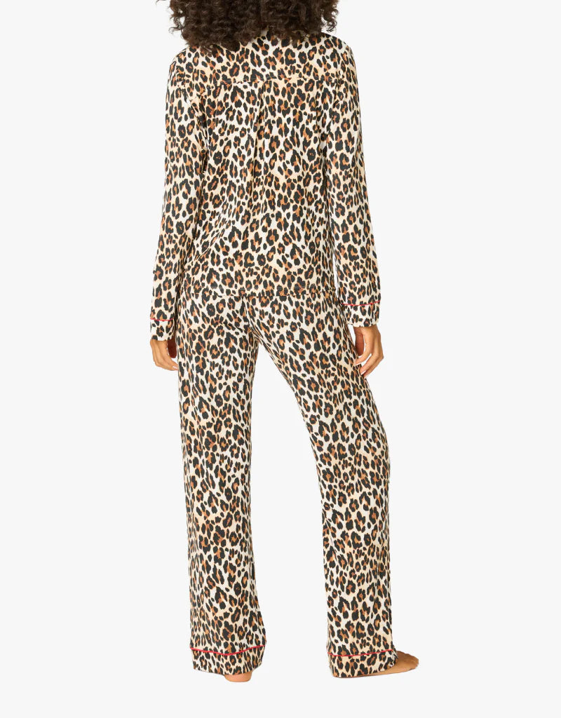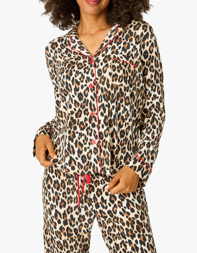 Unwind on the wild side in this modal jersey pajama set, patterned all over in leopard spots. The button-down top is finished with red piping and buttons, while the relaxed drawstring pants tie with a matching red ribbon—an easy way to add a fierce twist to cozy nights in.