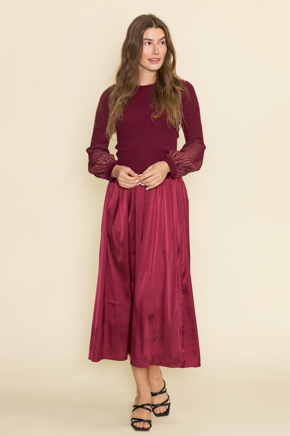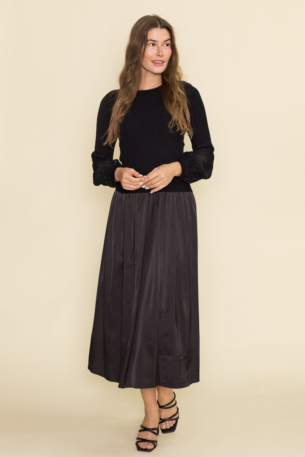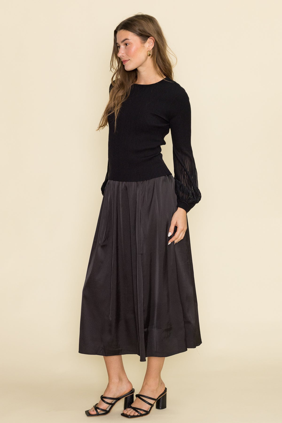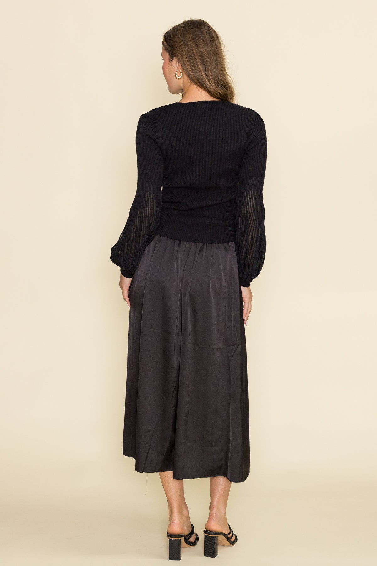 A play of volume and texture in a two-piece set. The pairing features a strappy midi dress and a fitted rib-knit sweater with long sleeves and voluminous sheer piecing. Wear them together or style them separately with items in your existing wardrobe.