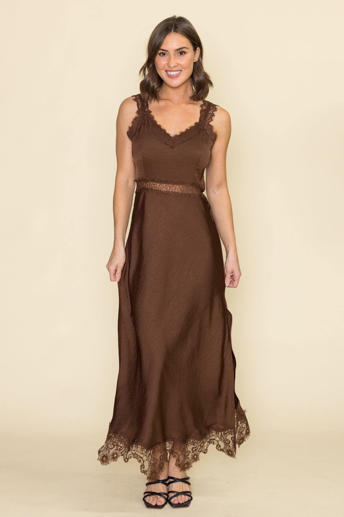 This mocha slip dress is a timeless piece for your wardrobe. Featuring delicate lace trim along the neckline and hem, it blends elegance with just the right touch of edge. Perfect for date nights, parties, or special occasions, this dress will have you feeling confident and chic all night long.
