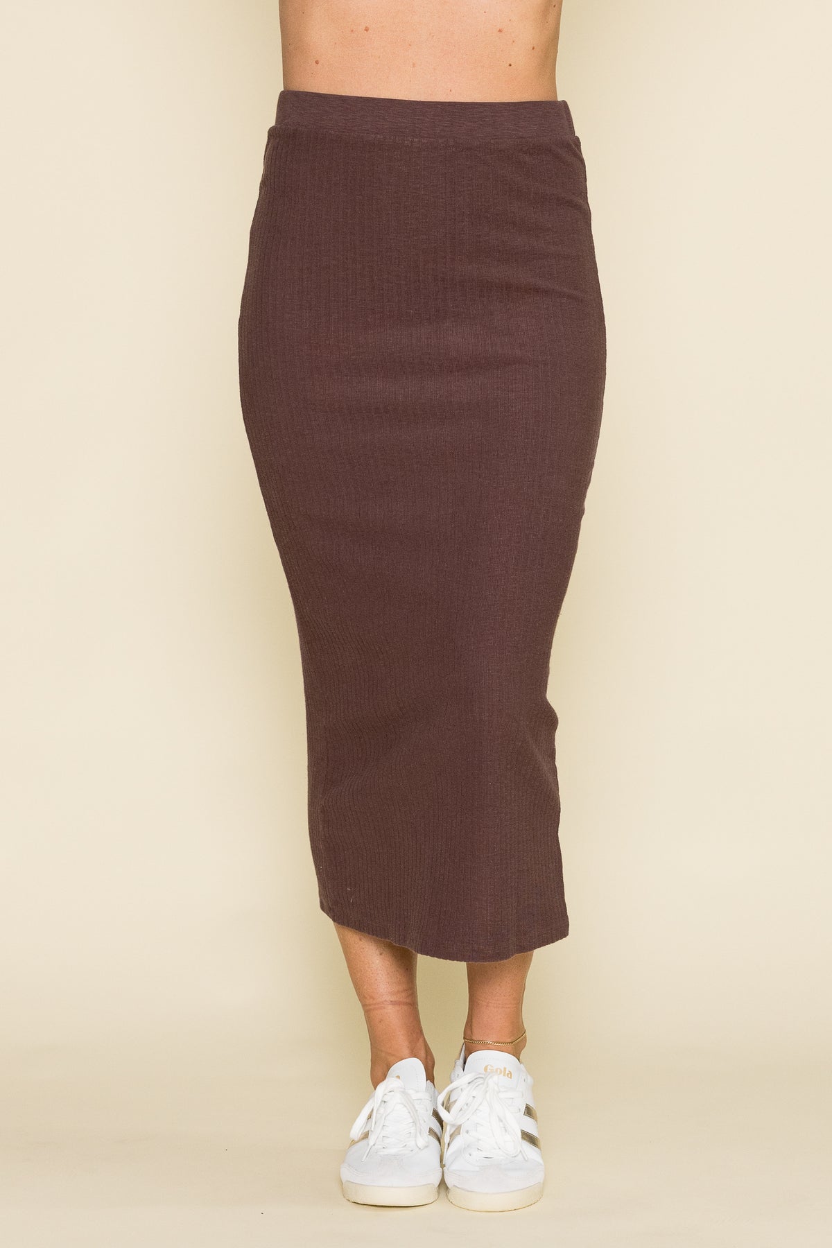 This rib midi skirt makes a statement without sacrificing comfort. Updated for the season in umber and a midi length, this style can be paired with your favorite jacket, blouse, or its matching long sleeve tee.