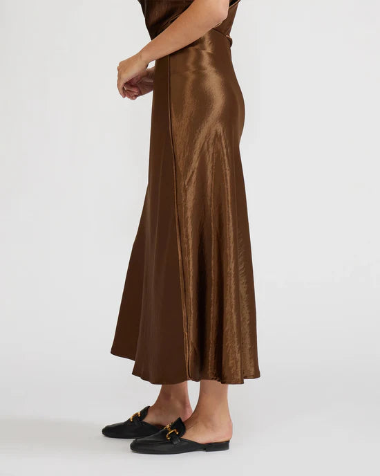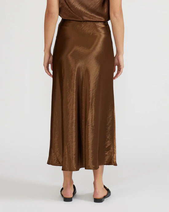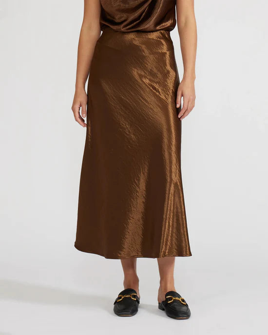 Shine in any setting with the Barbara Satin Skirt by Lucy Paris. This stunning skirt features a gorgeous bronze hue and a silky satin finish, making it a standout piece for any occasion. Effortlessly versatile, the Barbara skirt can be dressed up with heels and a blouse for a night out, or paired with a cozy sweater and boots for a chic daytime look. With its elegant drape and luminous sheen, the Barbara Satin Skirt is your go-to for polished style—day or night.