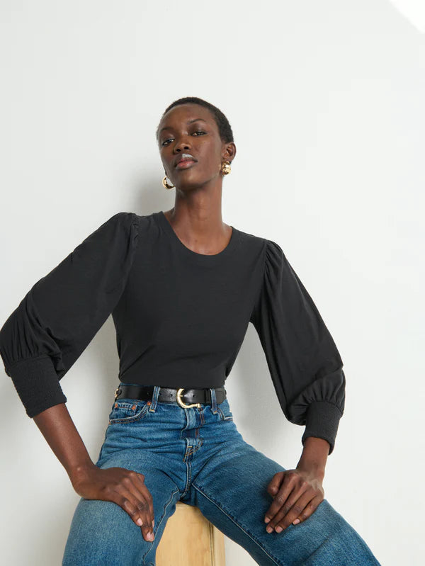 The ease of a comfortable cotton tee meets the look of a fancy blouse. An exaggerated shoulder, volume in the 3/4 length sleeve, and smocking around the cuff create a delightfully feminine look.