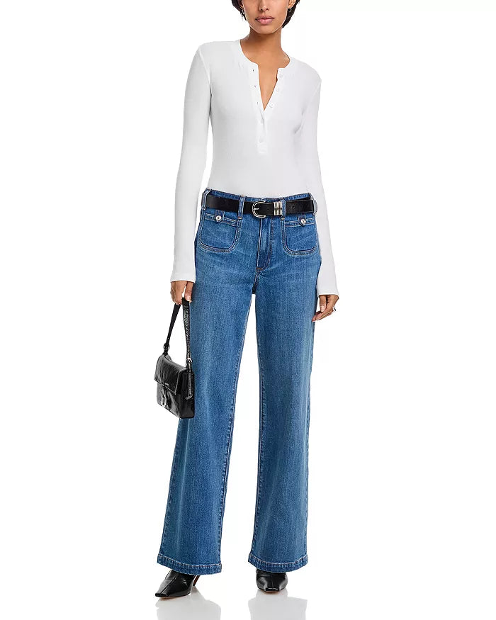 Anessa is a high-waisted wide leg with a slightly relaxed fit. In a tinted medium wash with rounded inset pockets, this pair is crafted from heritage-inspired denim with a soft hand-feel and a hint of stretch.