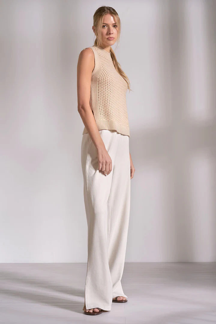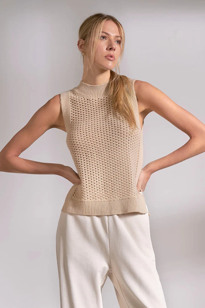 Effortless layering meets contemporary style with this sleeveless open knit top. The mock neck provides polished structure while the airy knit construction offers breathable comfort for transitional seasons. Perfect for pairing over fitted basics or worn solo for an understated, refined look. A versatile wardrobe essential that bridges casual and elevated aesthetics.