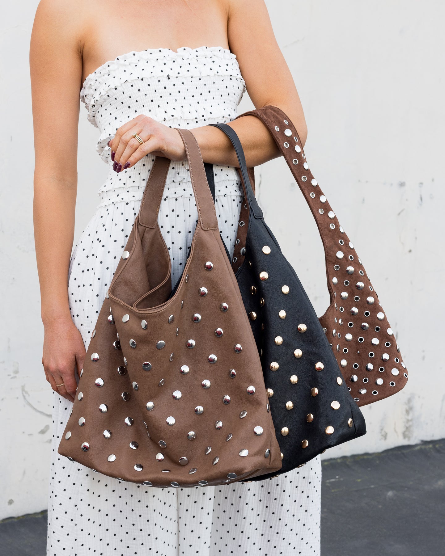 This hand bag introduces a unique studded leather handbag style. Explore a refined sense of style with this hand bag, seamlessly elevating the chic factor of your look.