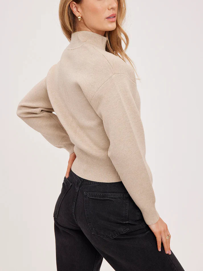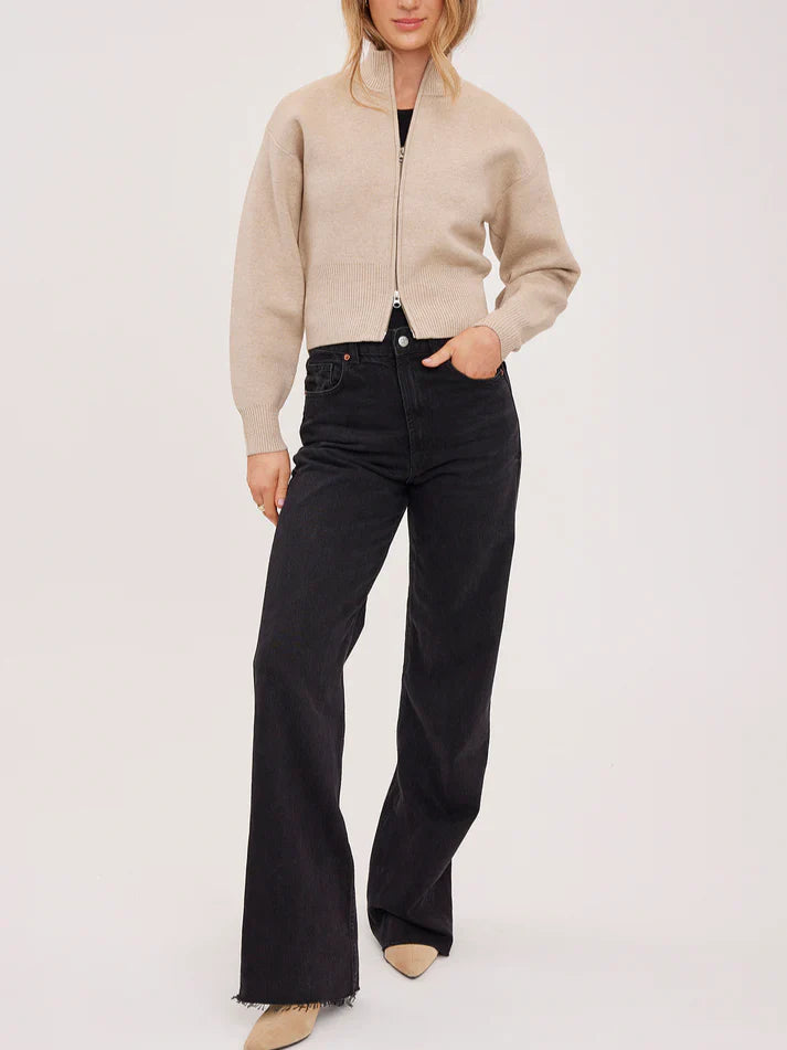 The perfect combo of cozy yet polished with a modern silhouette. This zip sweater features a a stand collar, zip-front closure, and a softly structured knit fabric with relaxed drop shoulders and ribbed cuffs for an easy and everyday fit.