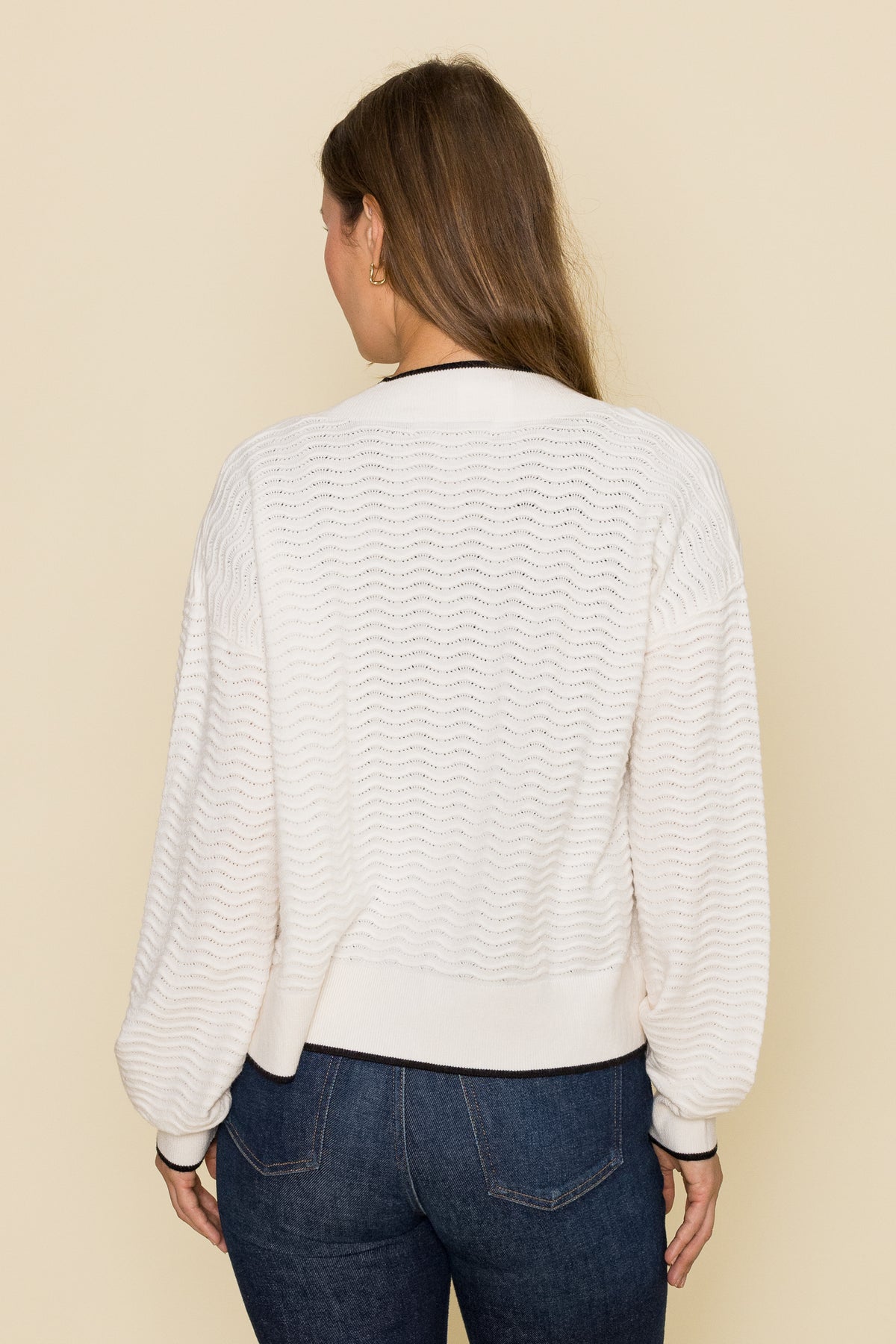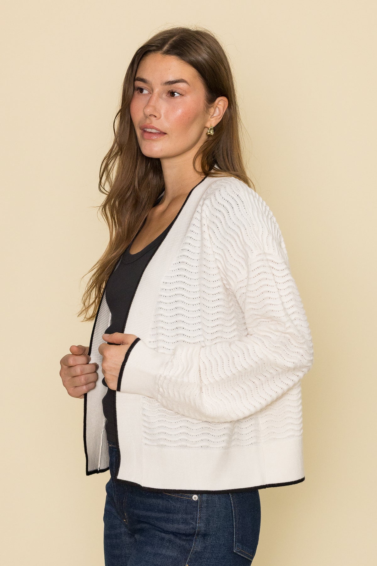 This versatile cardigan effortlessly elevates your style for work or the weekend. Its collarless silhouette, distinctive squiggle texture, and contrasting black trim add a subtle yet striking touch to any minimalist outfit. Ideal for layering over tanks or dresses, it’s the perfect lightweight piece to throw-on no matter the occasion.