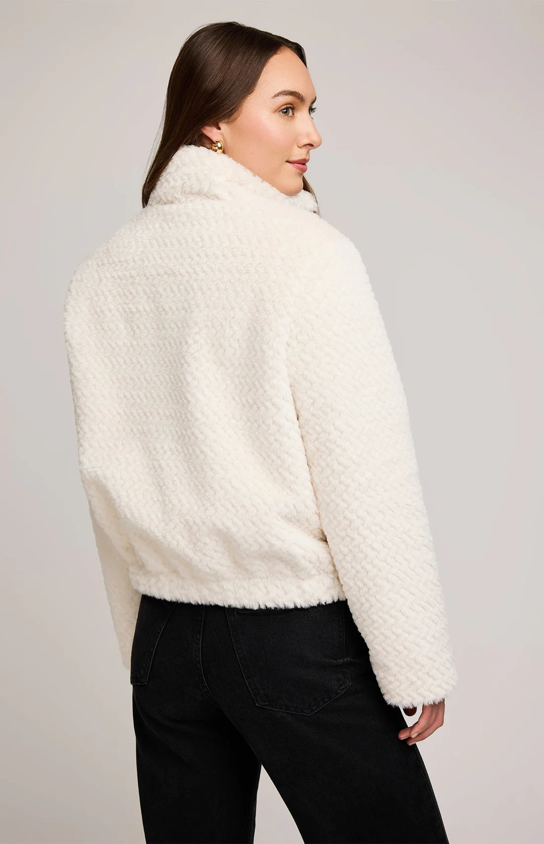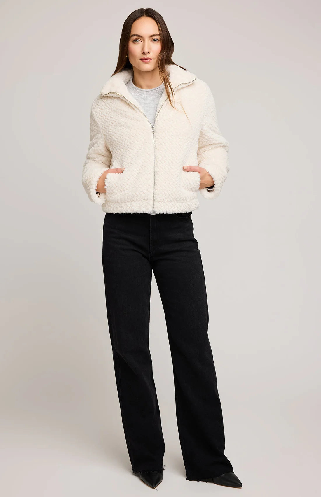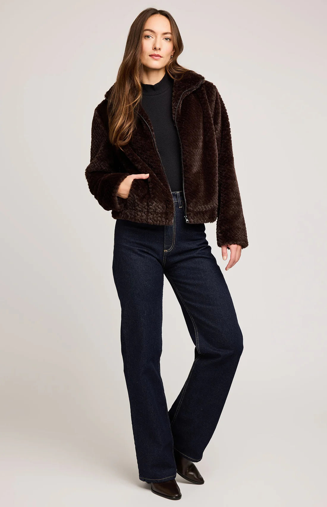 The Calista jacket is made of a faux fur fabric with a herringbone texture and is fully lined. Features include an elasticated waistband and inseam pockets.