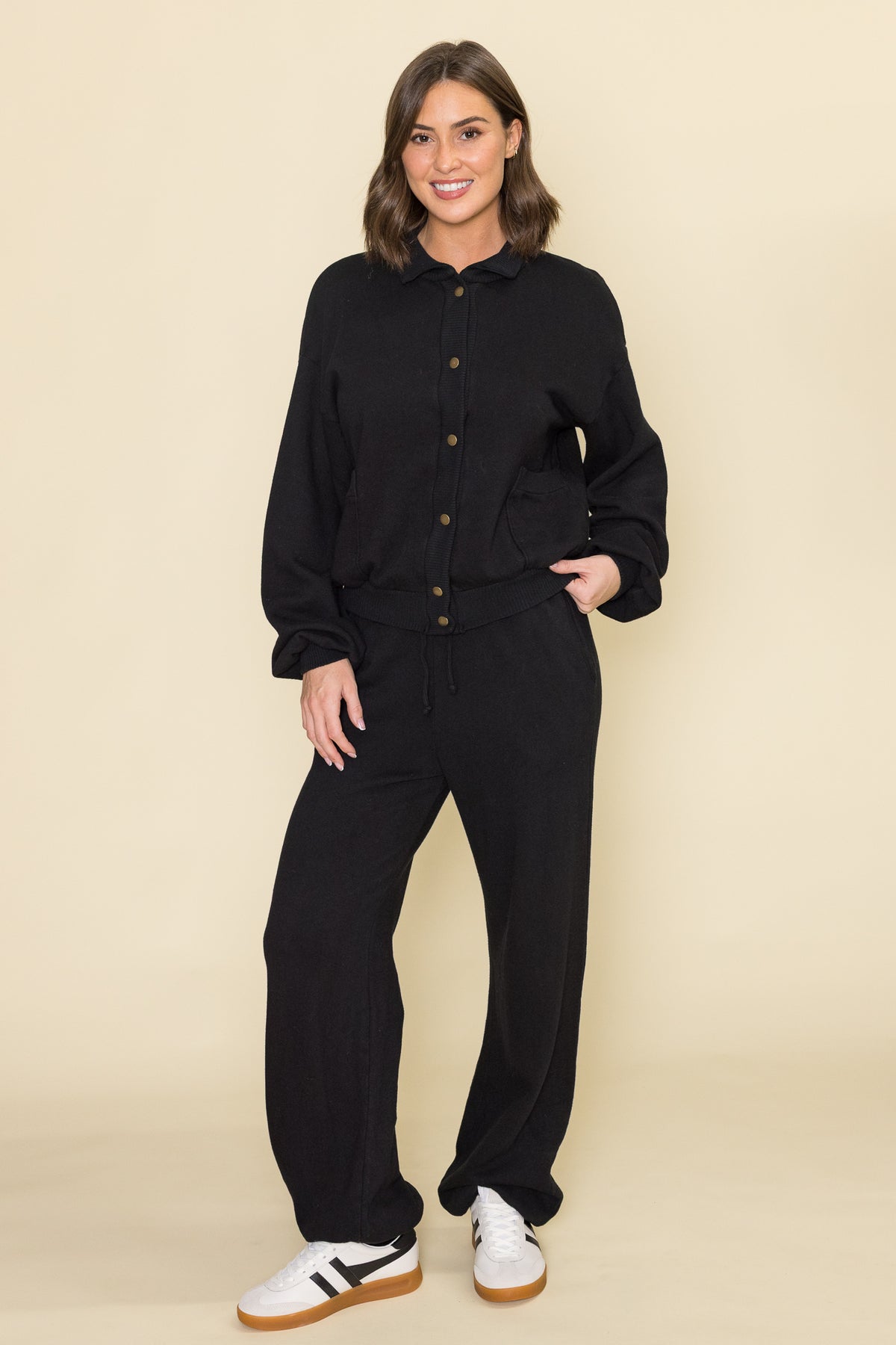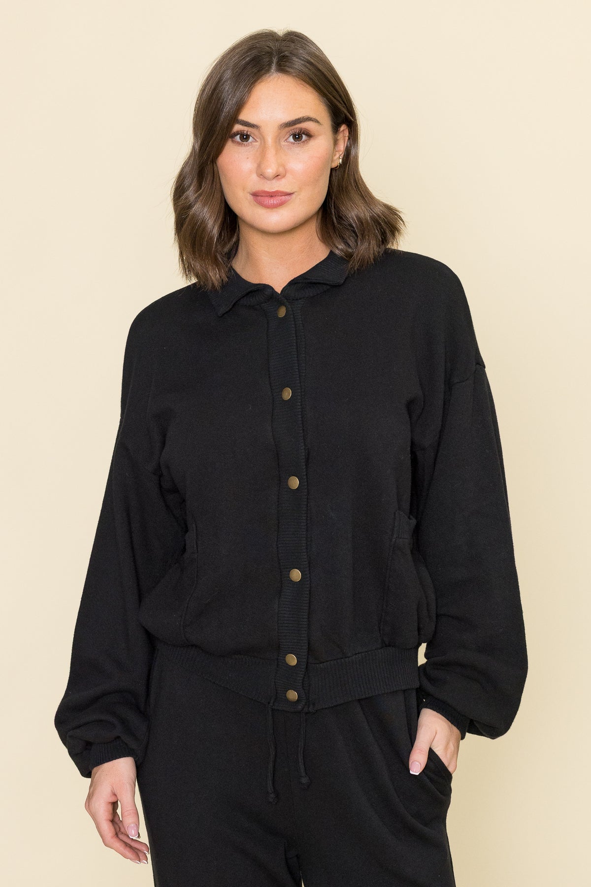 The It's a Lifestyle Jacket features a medium weight French terry fabric, acting as the perfect crossover between your favorite jacket and sweatshirt. It features a collared silhouette with antiqued brass snaps down the front. We're sure you'll find plenty of ways to wear this, but we like it paired with the It's a Lifestyle Jogger.