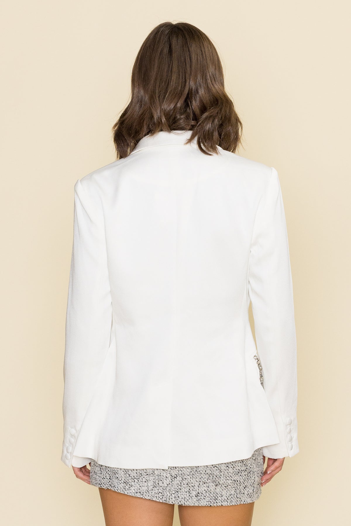Elevate your wardrobe with the Lucy Paris Manuela Crystal Trim Blazer! This single breasted blazer exudes sophistication and style, making a statement in any setting. Perfect for both formal and casual occasions, it is a must-have staple for any fashion-forward individual.
