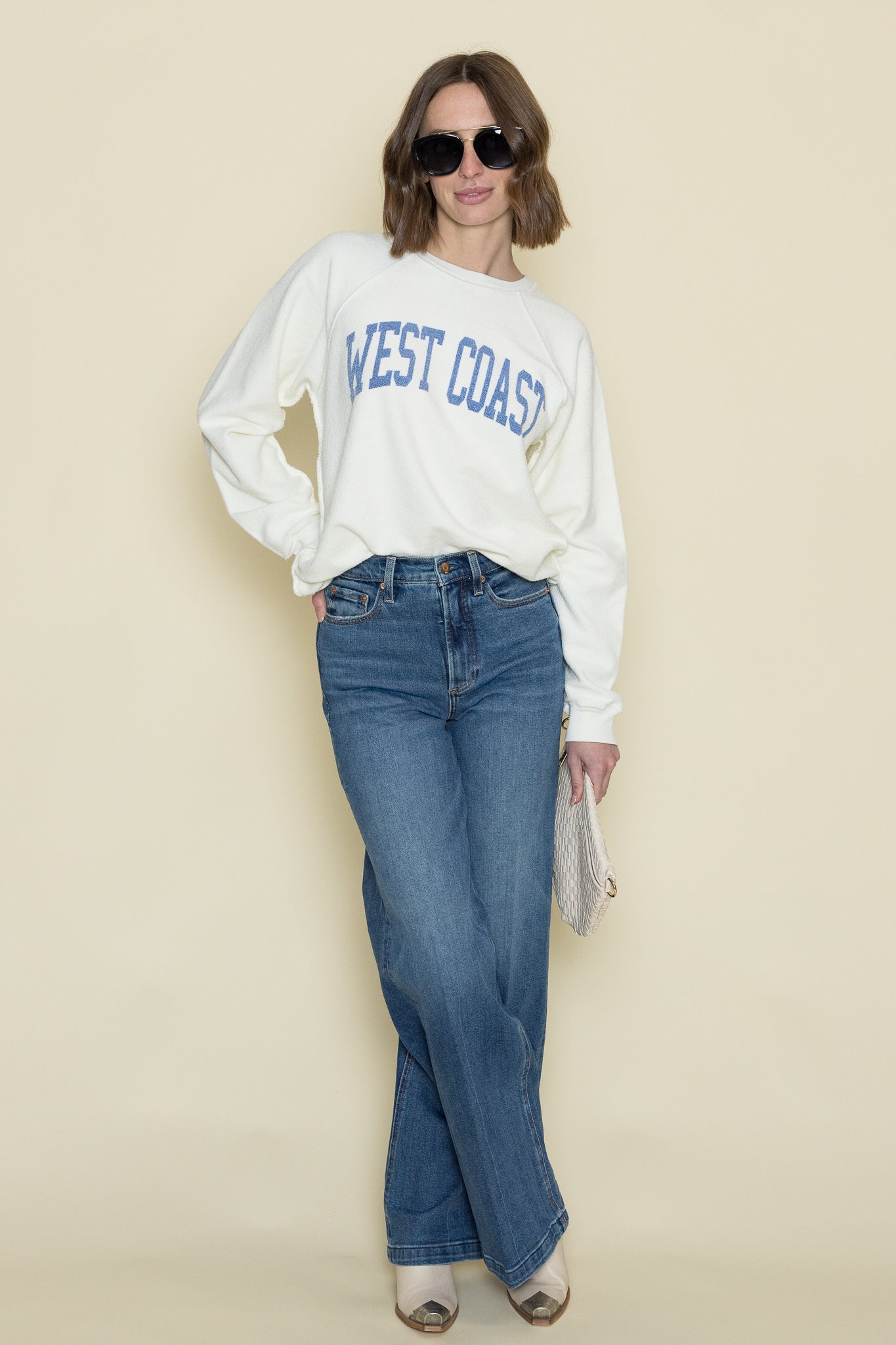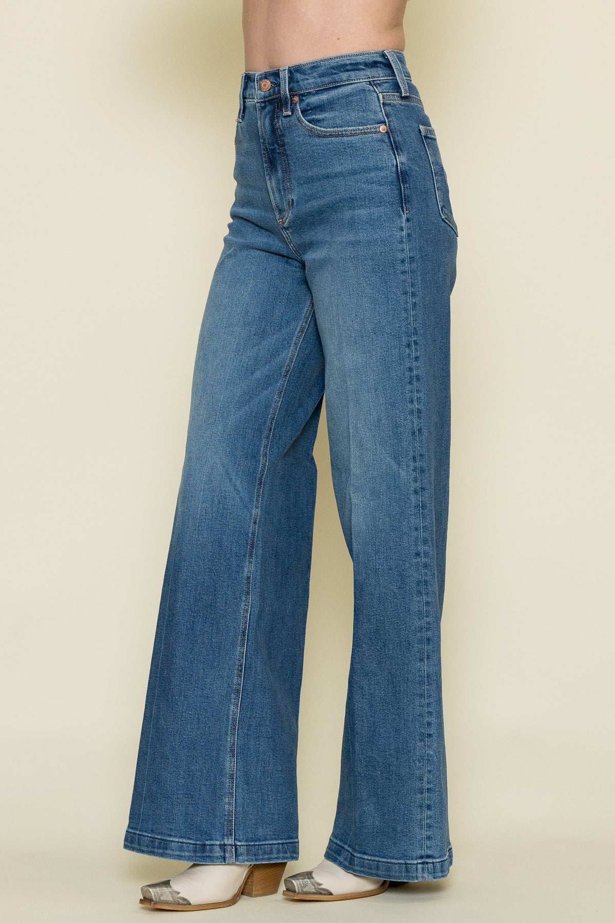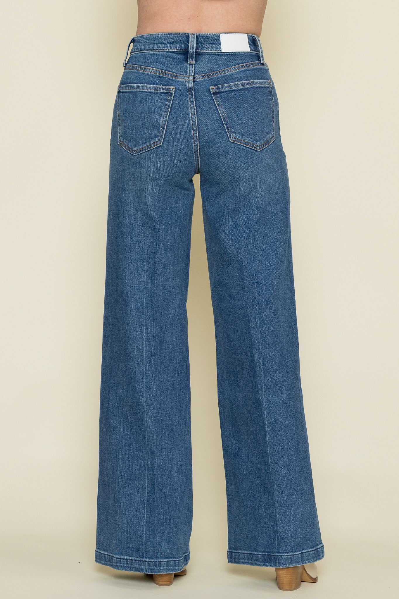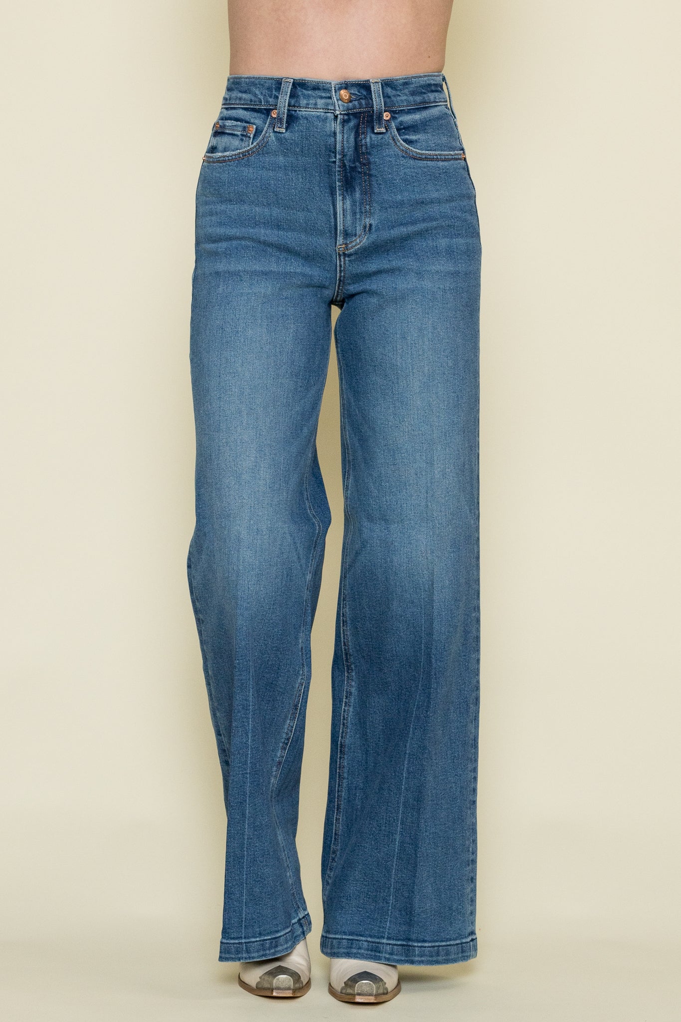 A relaxed, ultra wide leg silhouette with a high rise waist, breezy full length cut, and a clean finish hem. Crafted from comfort stretch denim to provide a structured shape with just the right give. Cider is a medium-dark indigo wash with sophisticated fading and laser whiskering details.