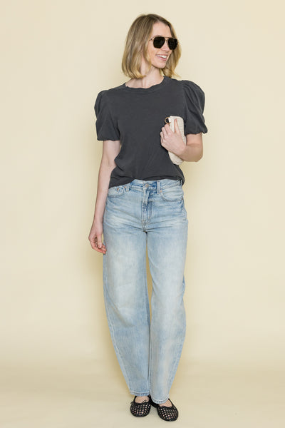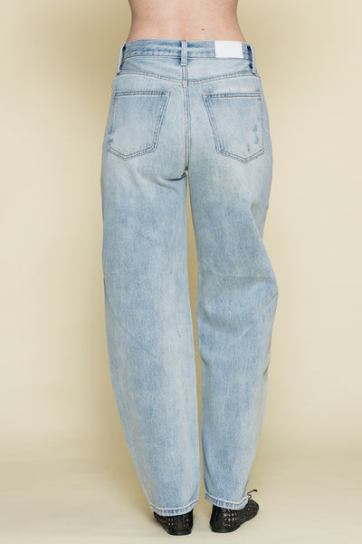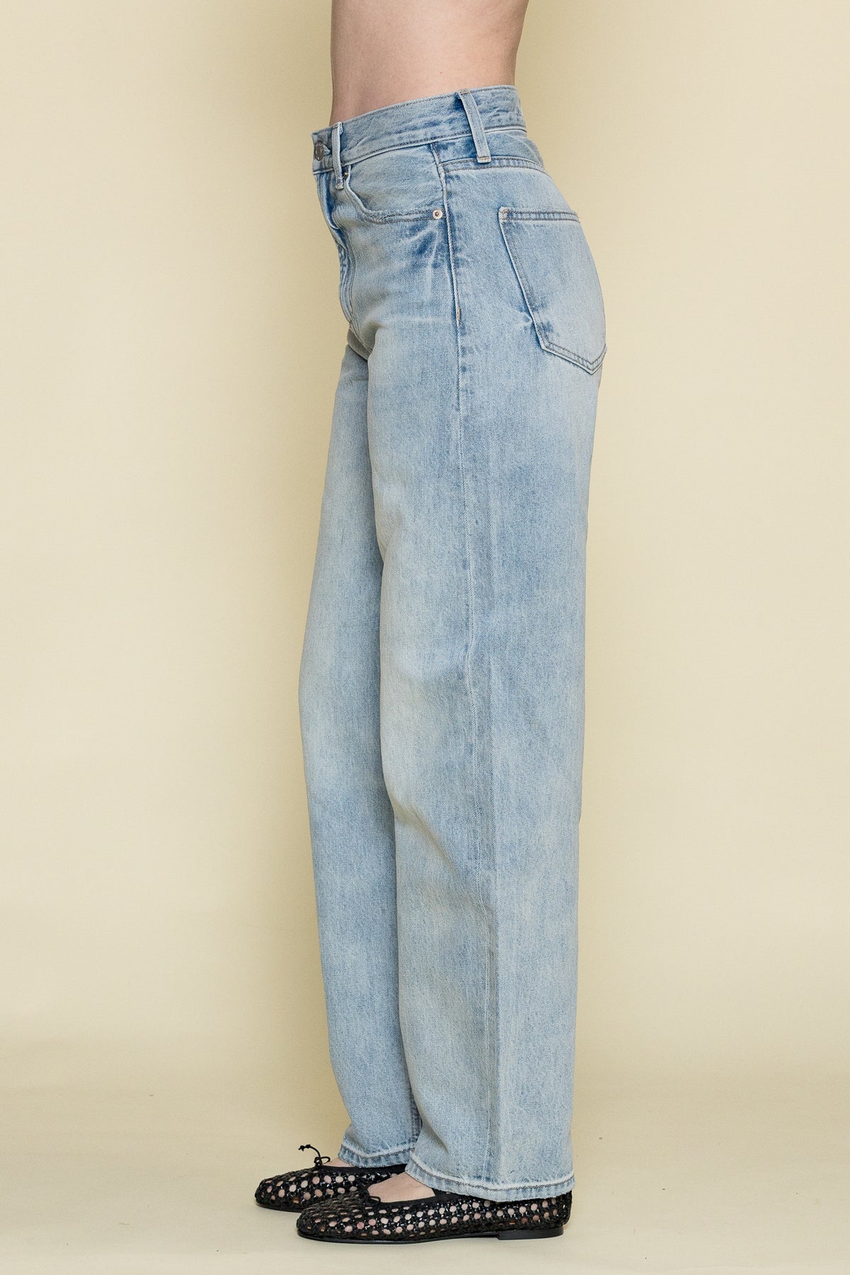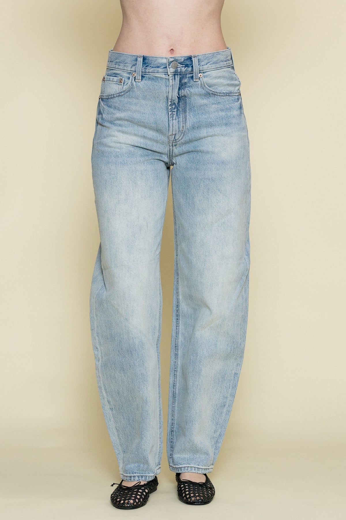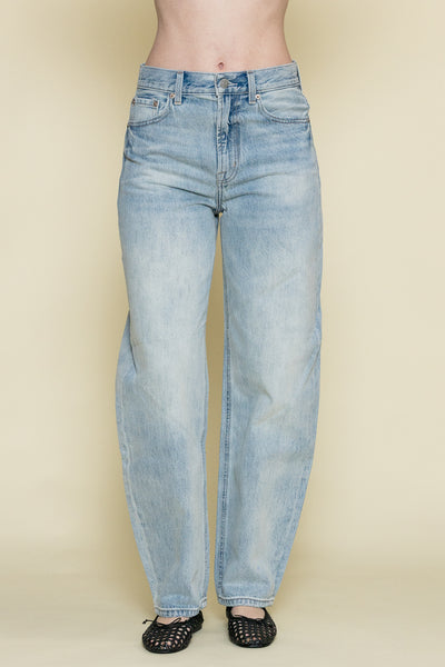 High rise waist with a full length 30" inseam and a barrel leg silhouette. Crafted from rigid non-stretch denim for an expert fit that holds its shape, with clean hem finishes. Clever is a vintage inspired light wash with moderate fading.