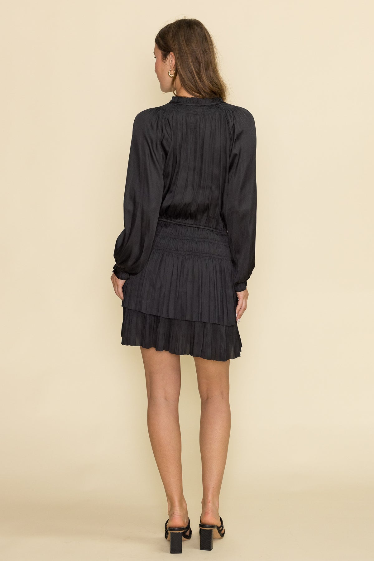 Introducing the Lana Dress, featuring a chic V-neck and delicate ruffle band collar with collar tie closure. The loose fit bubble top create a relaxed yet elegant silhouette, while the ruched shoulders and balloon sleeves add a touch of sophistication. The smocked waist and layered pleated skirt evoke luxury, while the silky satin fabric gives a premium feel.
