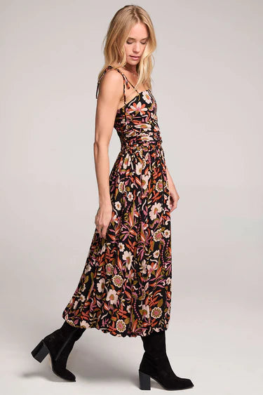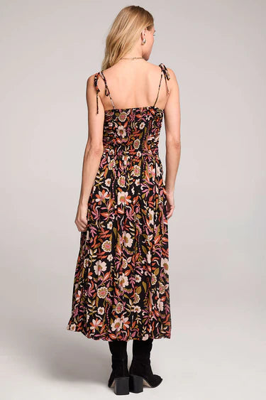 The Calysta Midi Dress combines a simple tank-style bodice with a full skirt crafted from lush, oversized dark floral fabric.