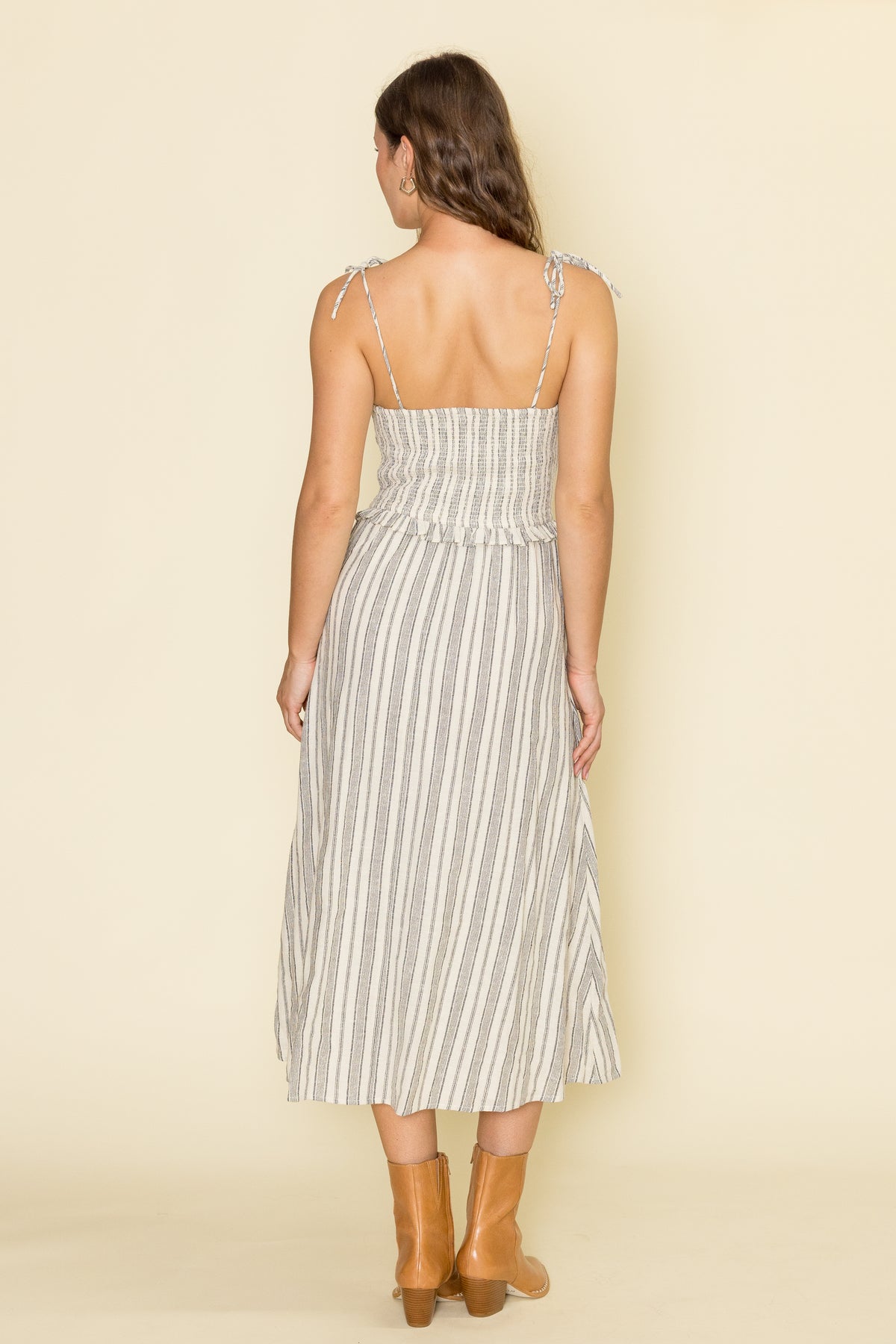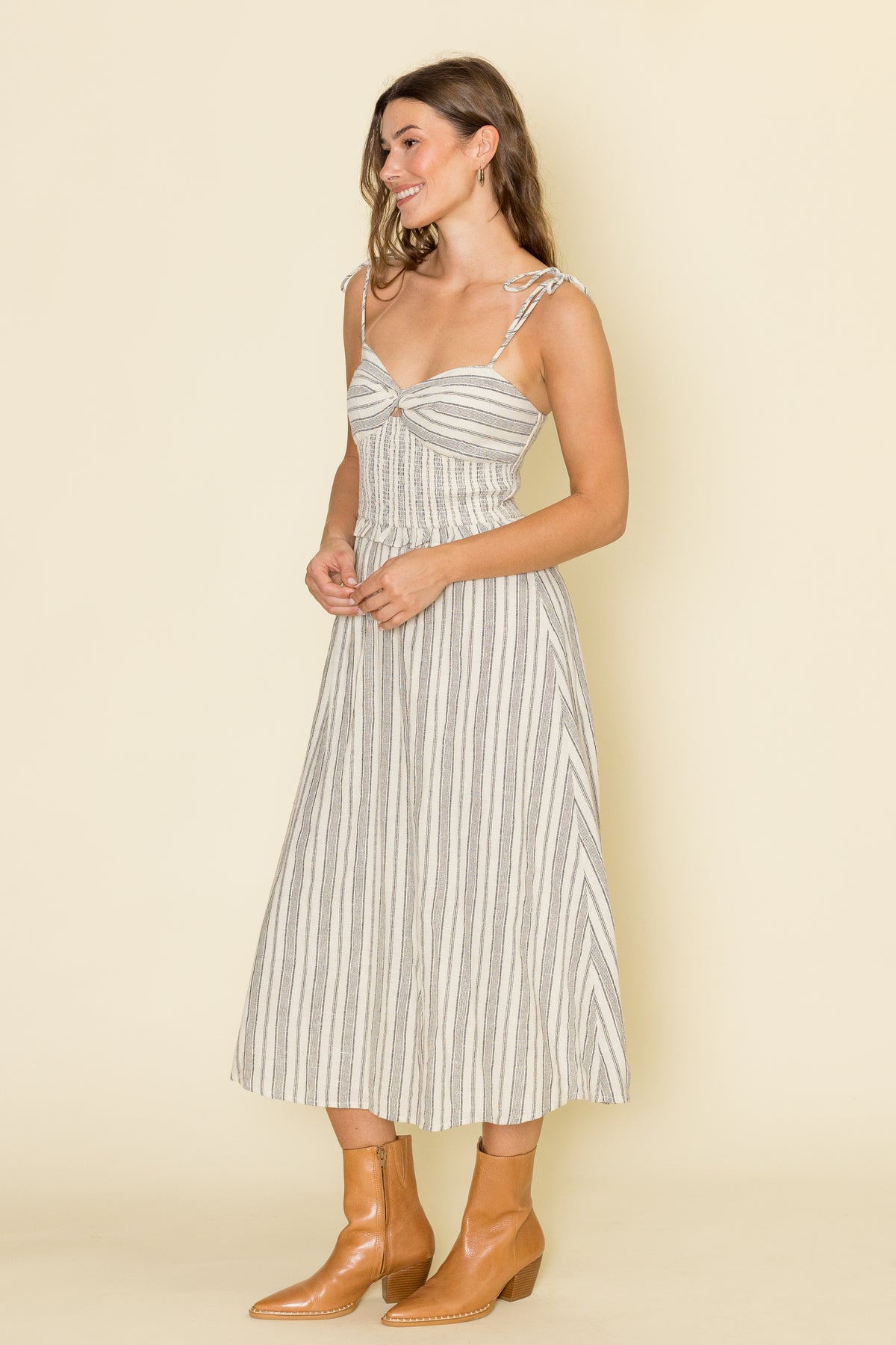 Introducing the Dale Midi Dress, a breezy style with smocked bodice and a playful cutout at the front.