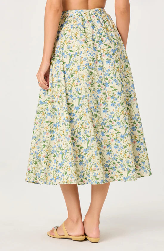 Delicate florals and soft cotton create timeless elegance in this gathered A-line midi skirt. The all-around gathered waistband adds dimension, while the flowing silhouette offers versatile, feminine style.