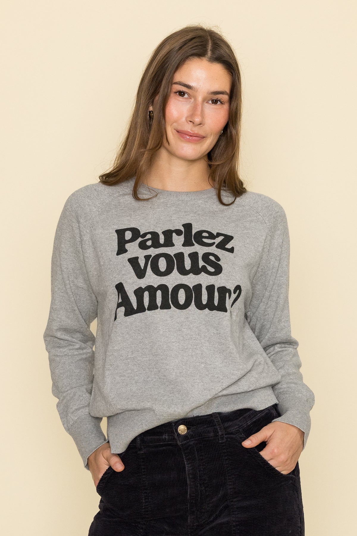 Add a playful touch to your fall wardrobe with the John & Jenn Callum Top in French Grey. This adorable sweater adorned with the charming "parlez vous amour?" print, brings a sweet and cozy vibe to any outfit.