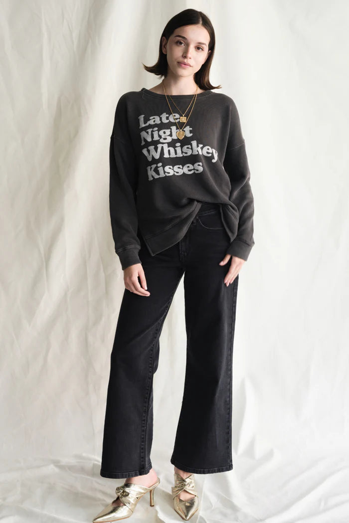 Ready for those late nights and sweet moments? This vintage black pullover sweatshirt is for the romantics and the rebels. Made for ultimate comfort, this crewneck features a bold, vintage-inspired "Late Night Whiskey Kisses" print. The classic black wash gives it a lived-in, effortless feel that's perfect for cozy nights in or daring nights out.
