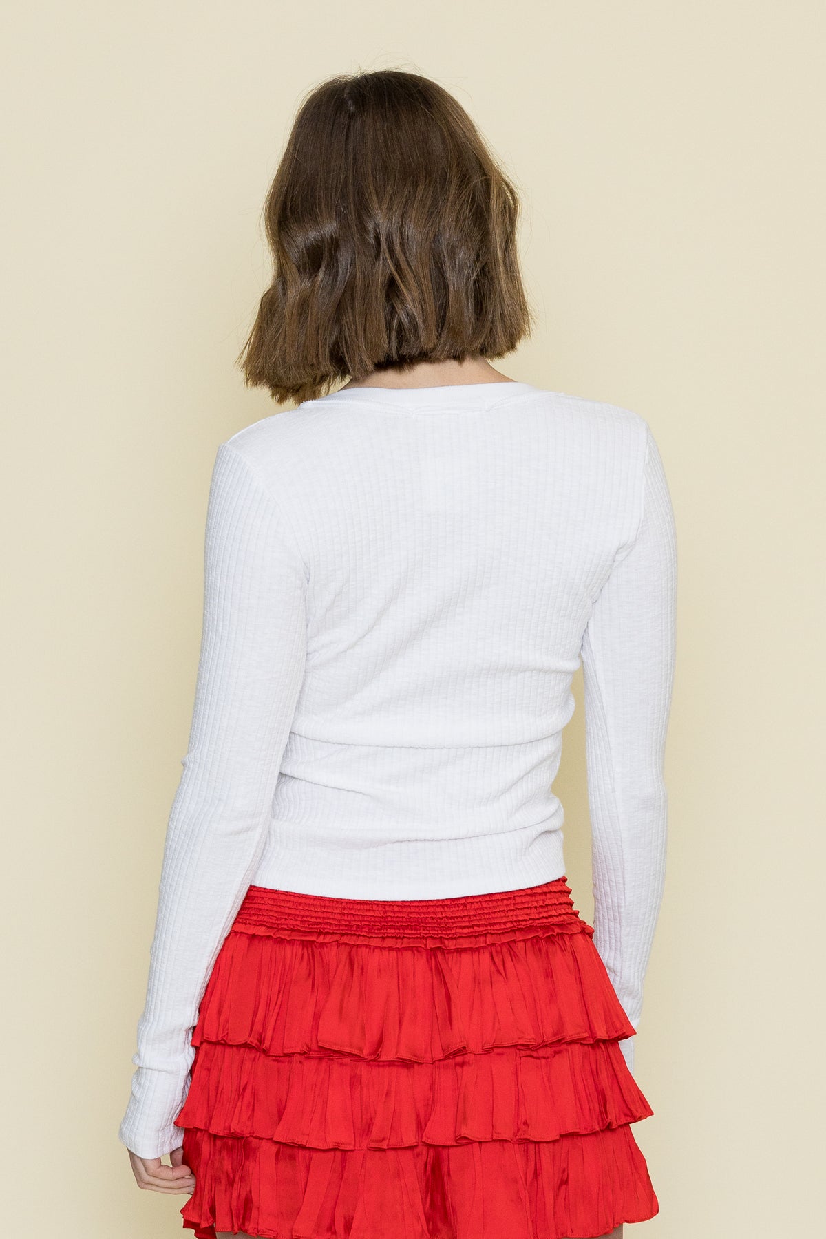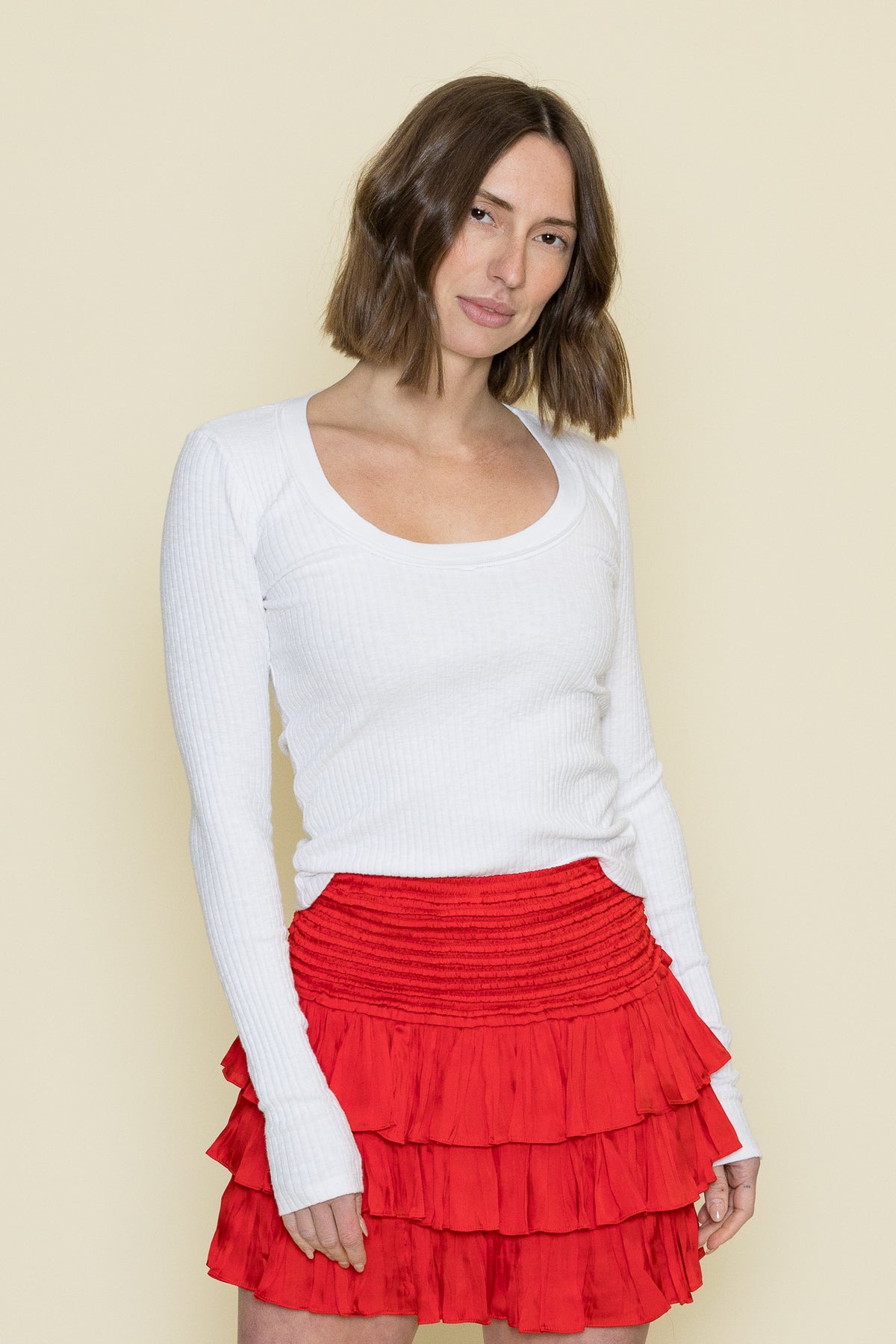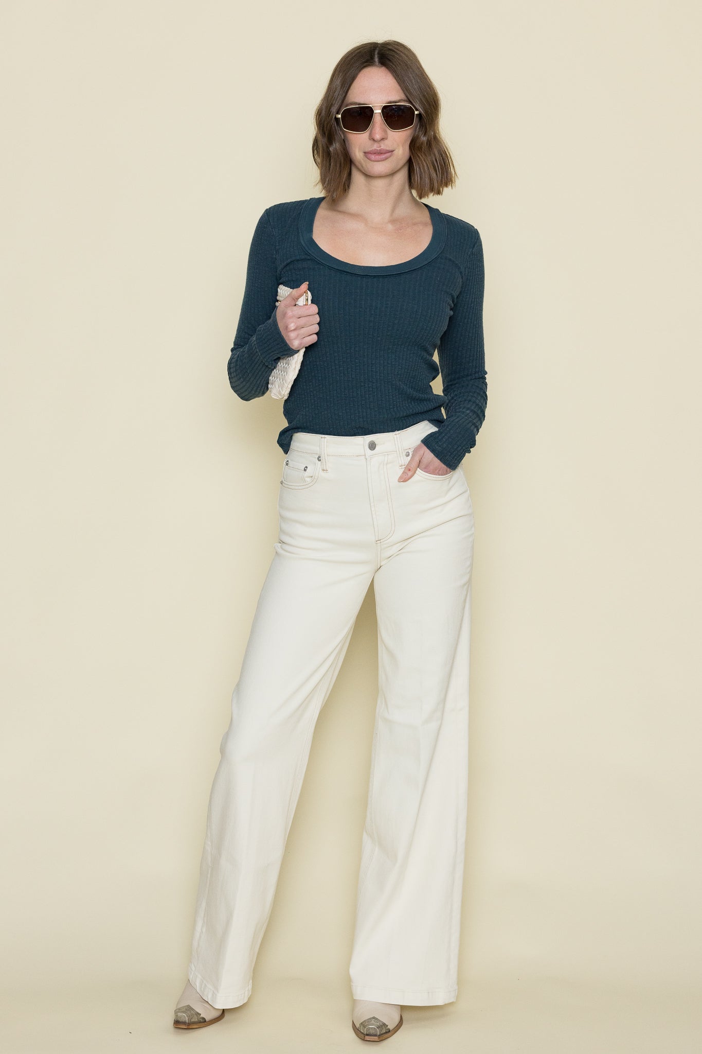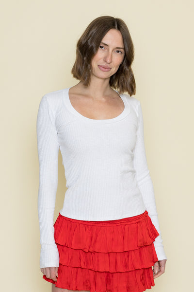 Here to give you the scoop on your newest closet staple. The Rae Ribbed Long Sleeve has a fitted silhouette and is made with an iconic sweater rib fabric. Combine those two details with a flattering scoop neckline, and you have a tee that pairs well with just about anything.