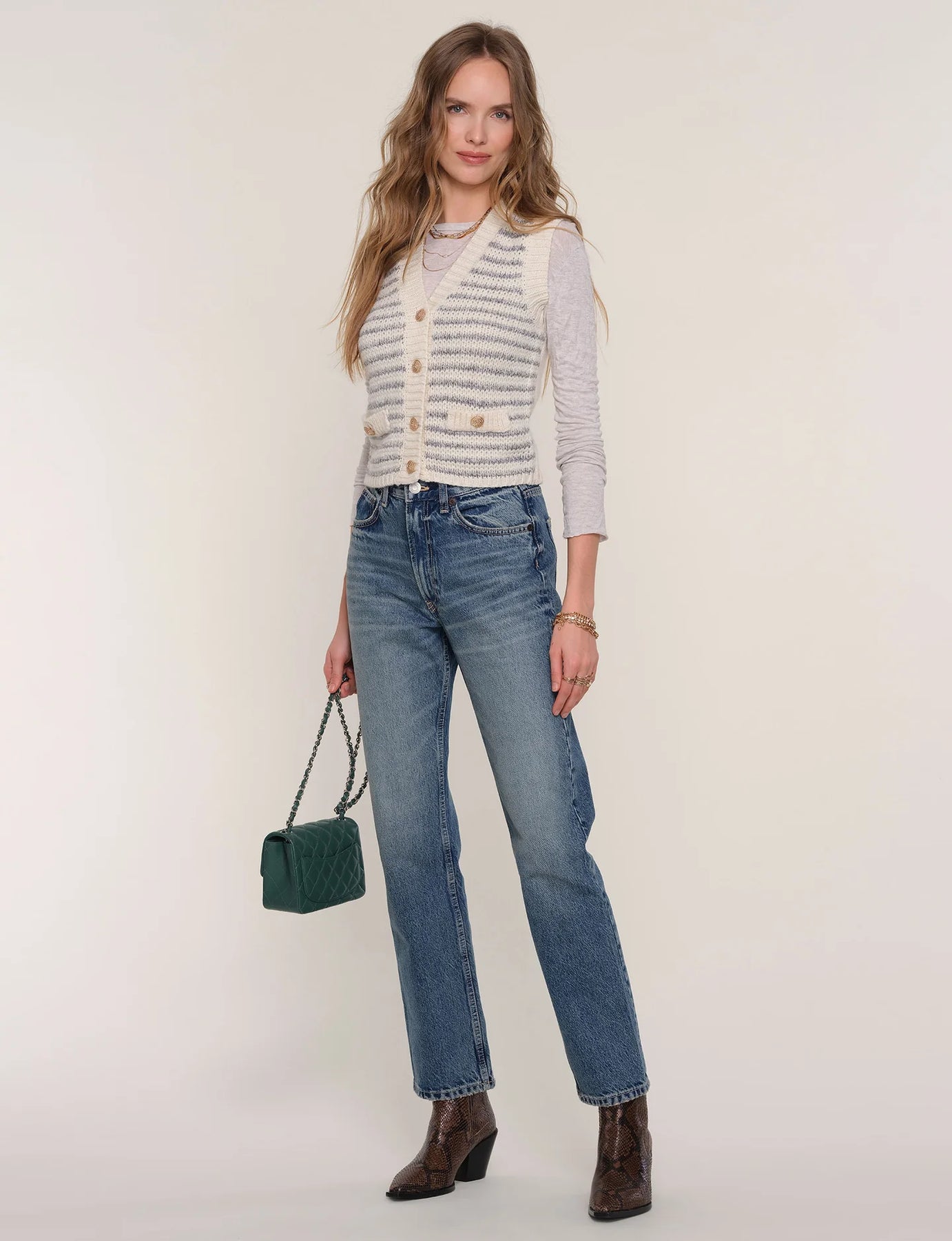 The Asher Vest is a Heartloom favorite for the season. It is made from a striped knit and features a contrast rib trim and novelty buttons. Dress it up with a wide leg trouser, or dress it down with denim.