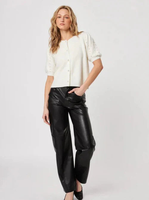 The Arden Sweater by John & Jenn is a beautifully embellished short-sleeve knit designed in a soft ivory hue. Its delicate detailing and subtle shimmer give this cozy yet refined piece an elevated edge—perfect for dressing up denim or layering with tailored separates.