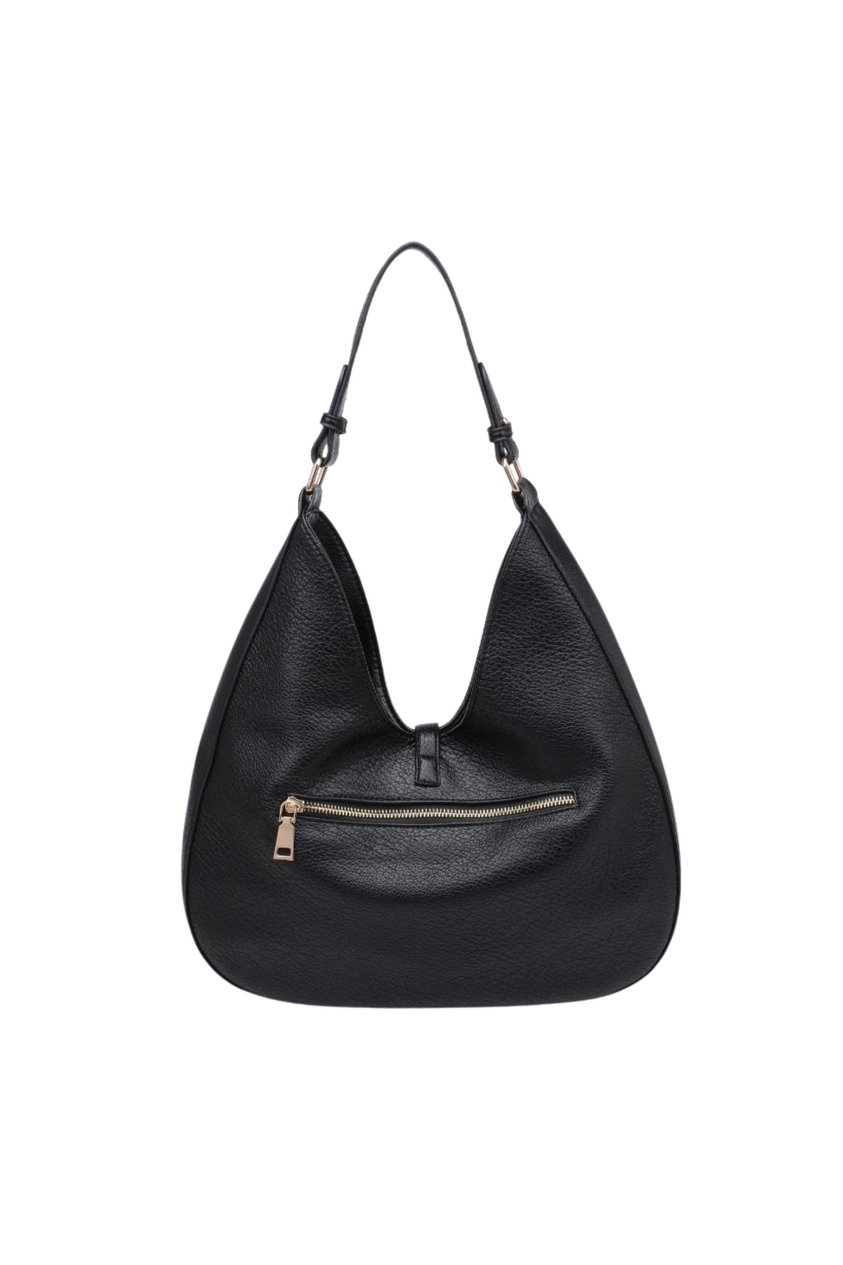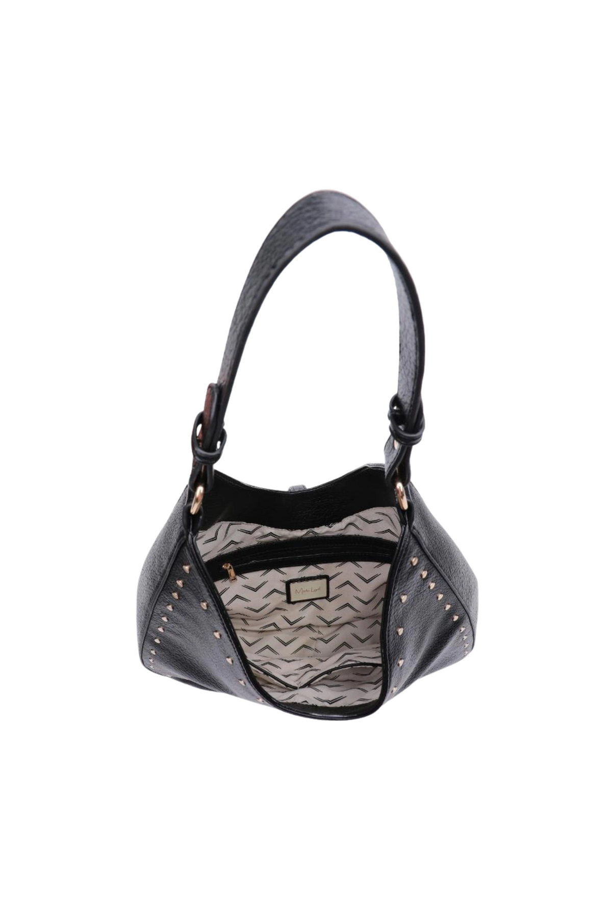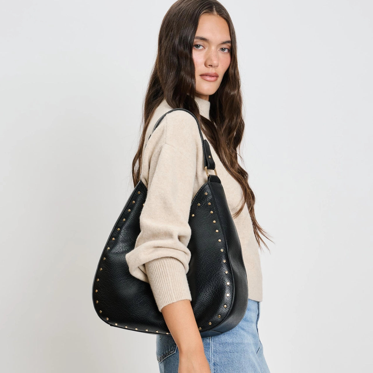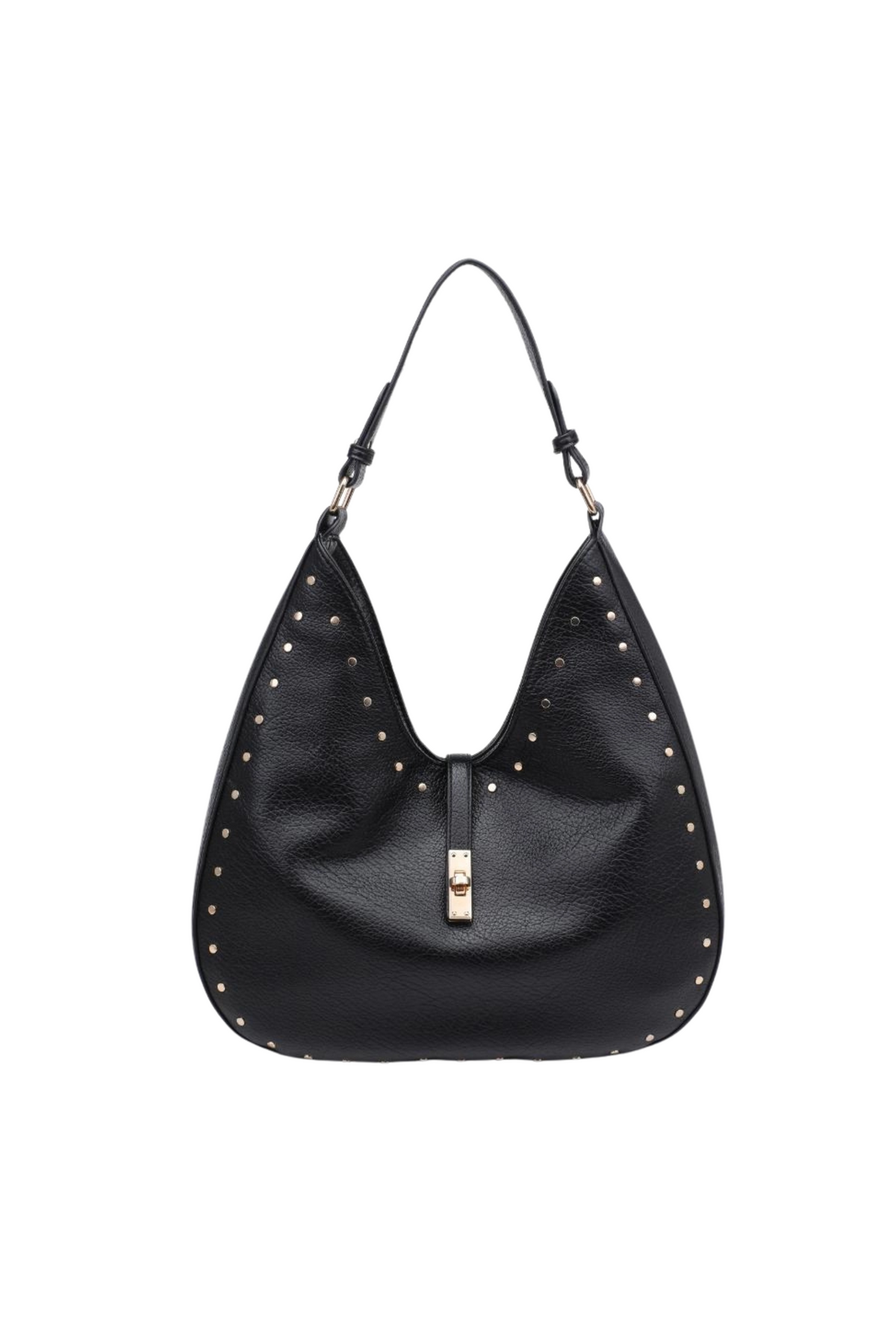 Introducing a hobo bag that effortlessly blends edge with elegance, crafted from pebbled vegan leather. The exterior boasts stud embellishments and gold hardware, while the turn lock loop closure adds a touch of sophistication. Inside, a printed fabric lining, one zip pocket, and two slip pockets ensure your essentials are stylishly organized.