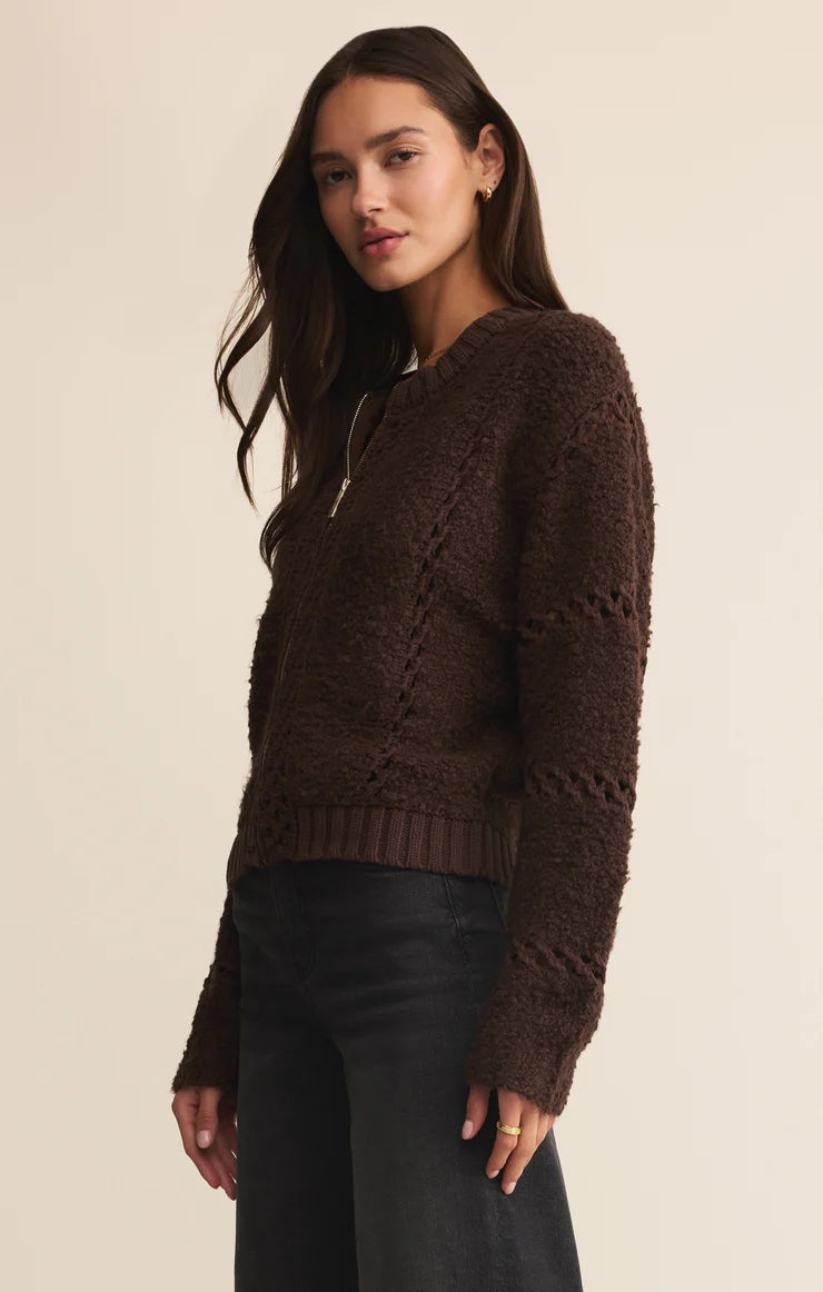 Soft texture meets delicate details in this zip-up sweater, crafted from plush, high-pile yarns and finished with intricate crochet insets and ribbed trim. It’s a feel-good layer that adds polish to any look.