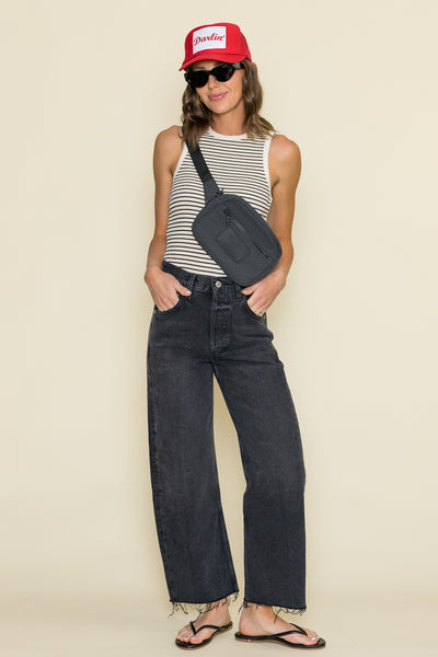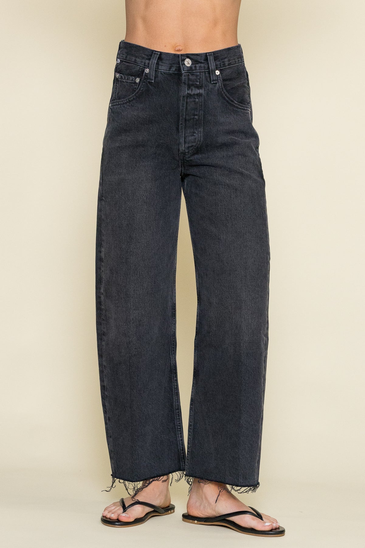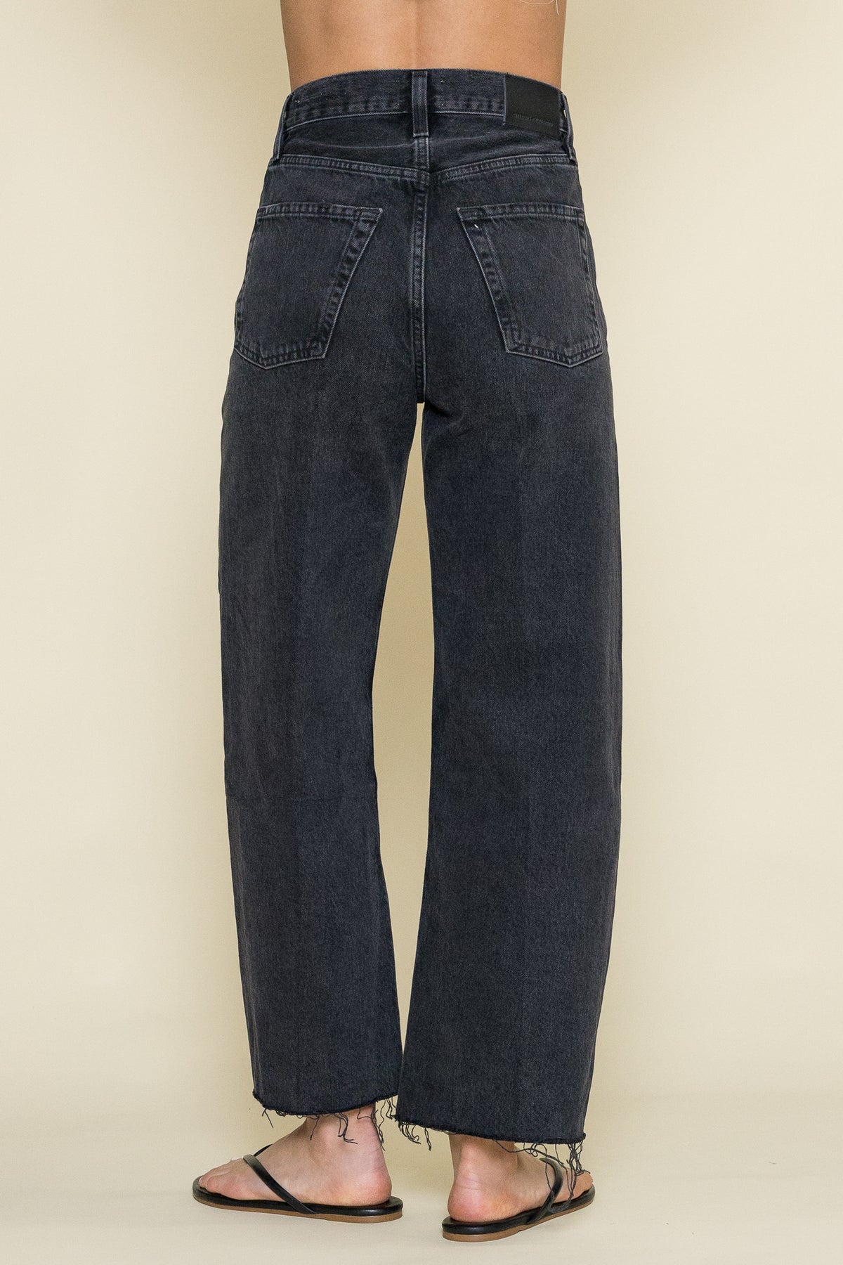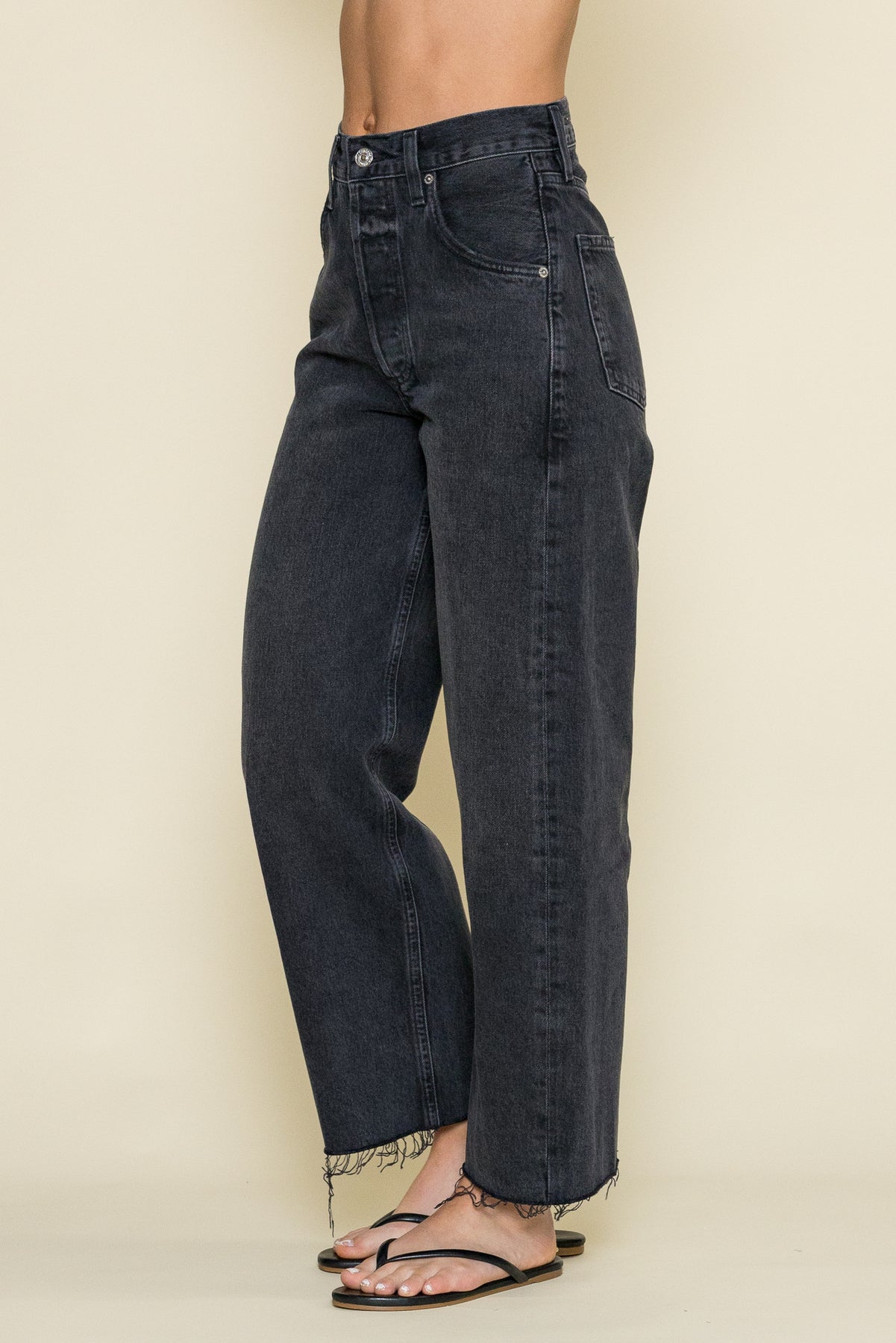 Switch it up on denim day with sturdy nonstretch jeans sporting a high waist, a baggy fit and cropped, fraying hems that relax the look.