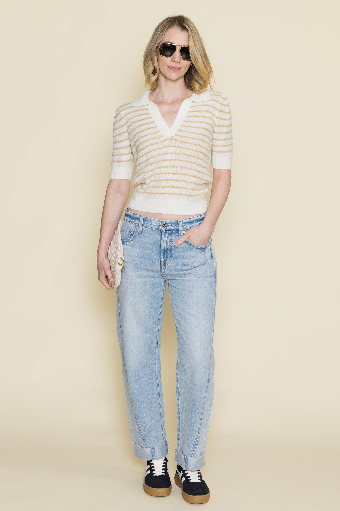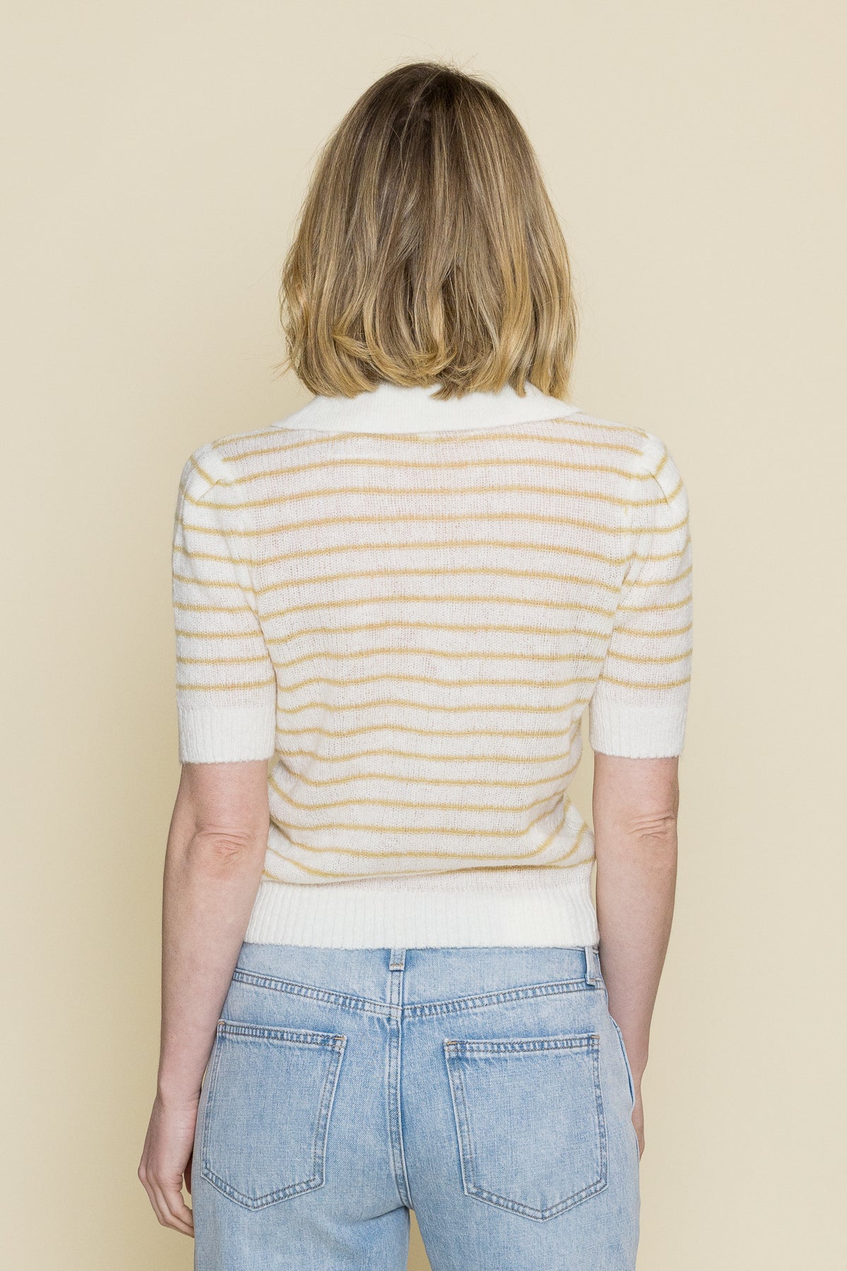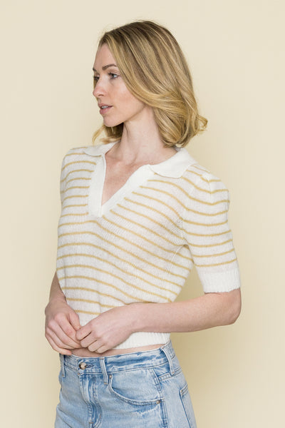 A jaunty, preppy flair defines this short sleeve sweater with an open v-neckline, spread collar and ribbed cuffs. Crafted from a lightweight transitional knit in a navy blue and white striped palette.