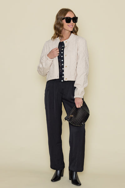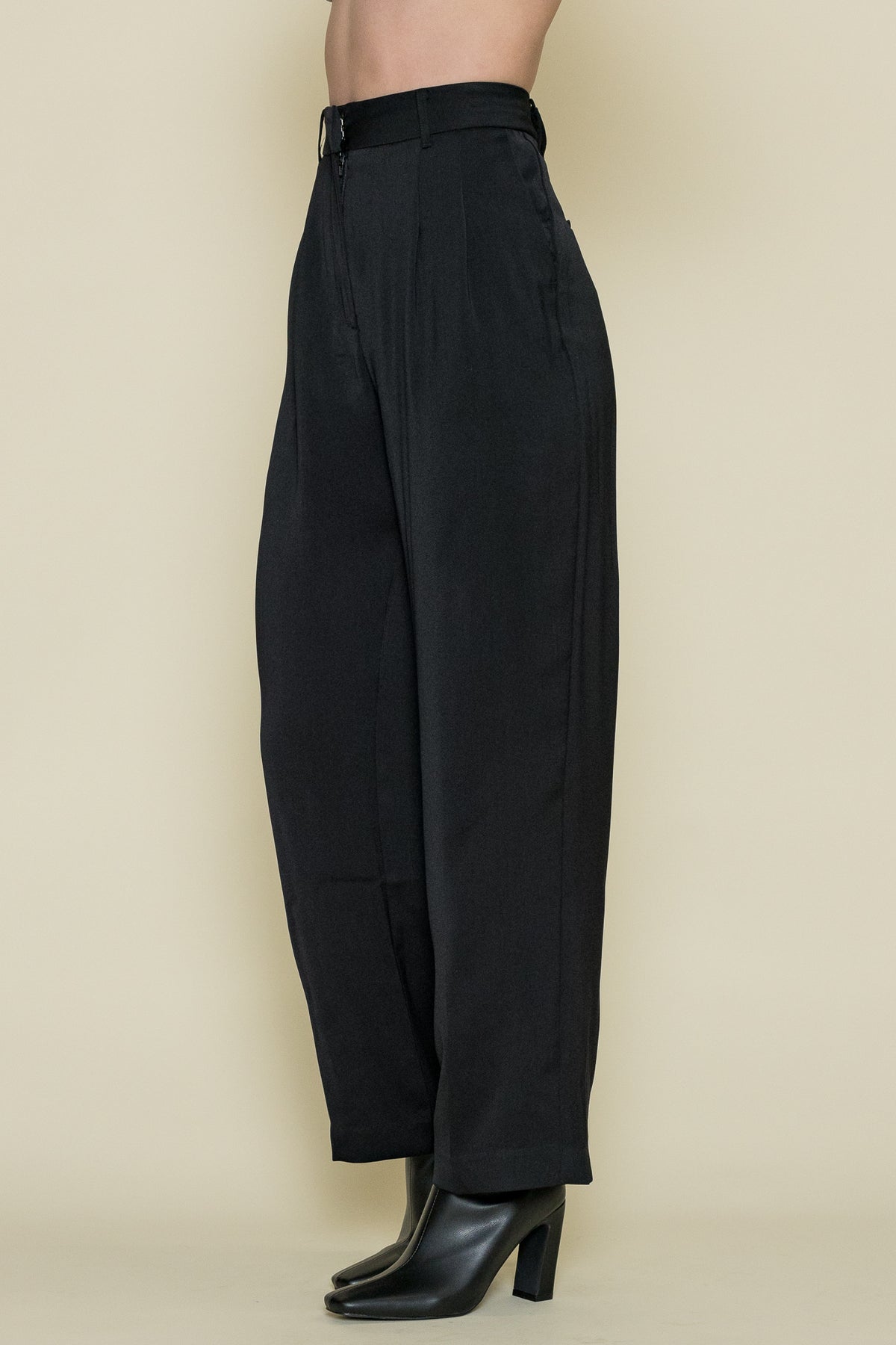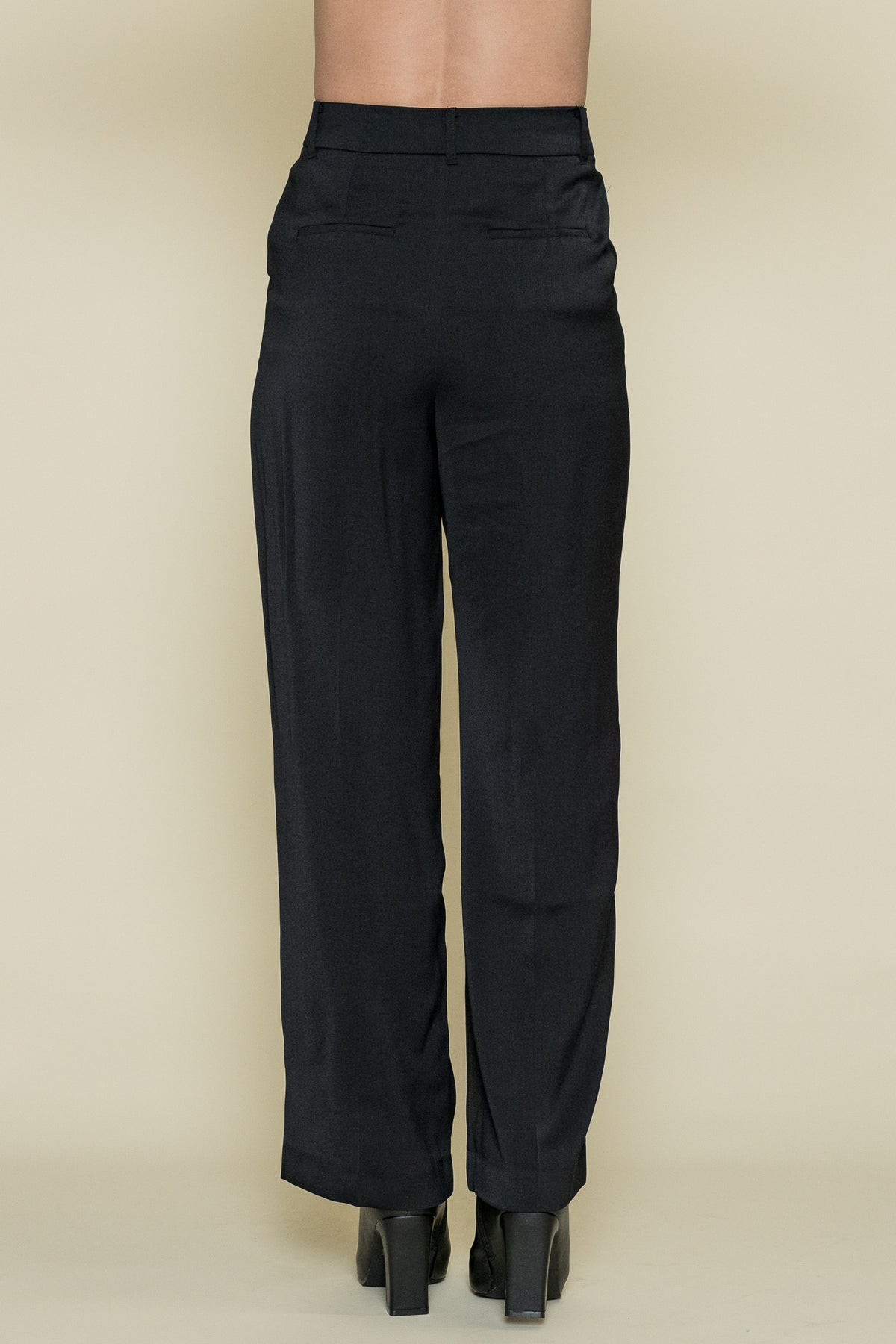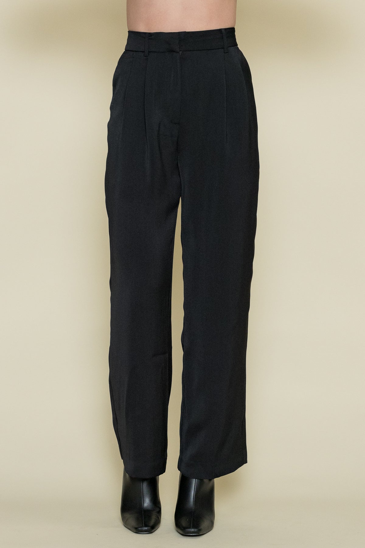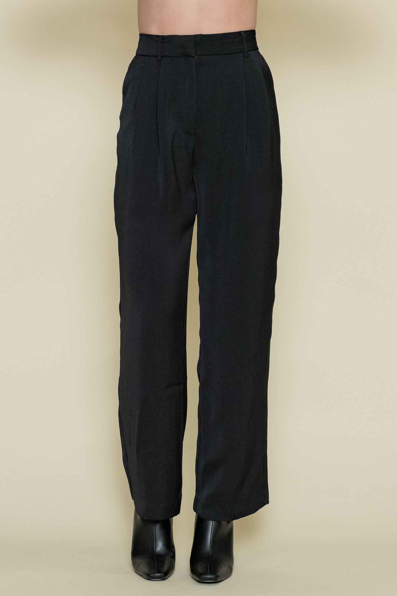 Get your style game on with the Cady Trousers! These high-waisted black trousers feature front pleats for a flattering fit. Perfect for any occasion, add some edge to your wardrobe with this quirky, versatile piece. (Fashion-forward without the fuss!)