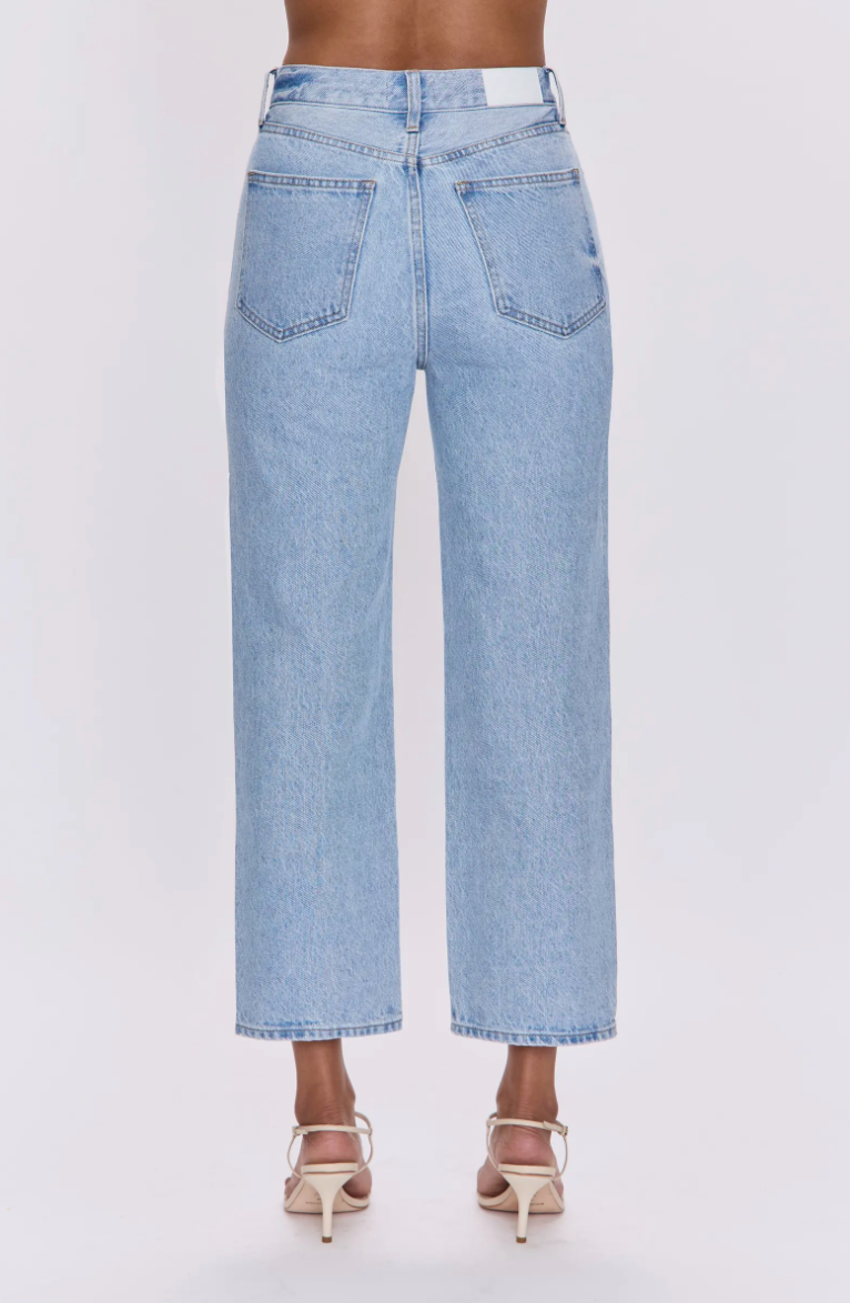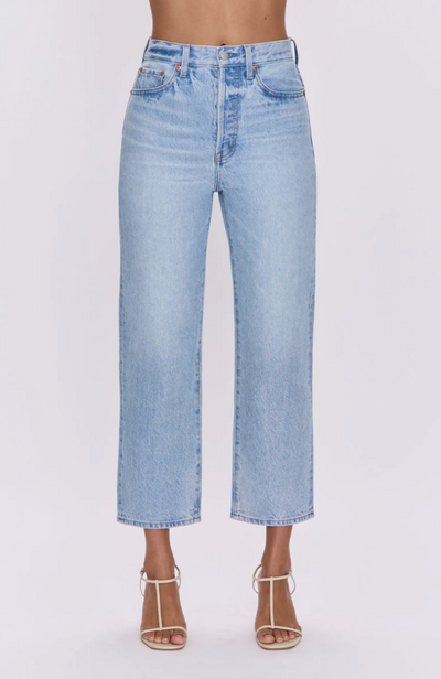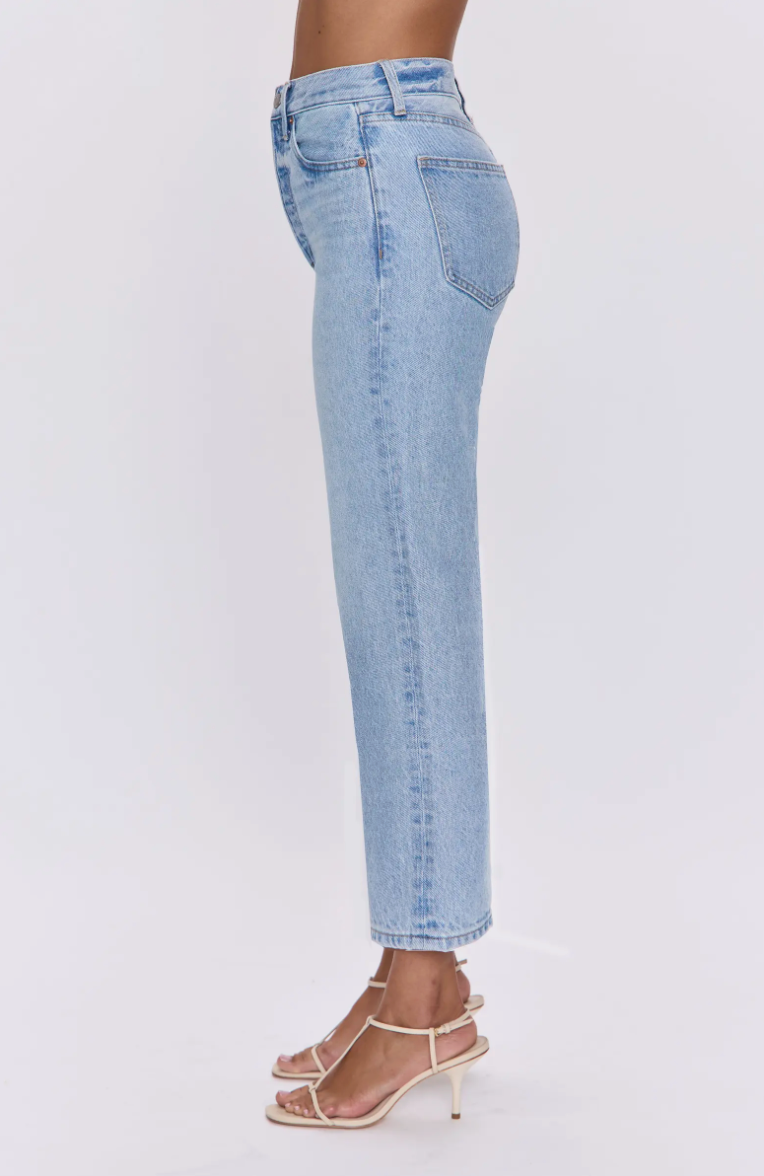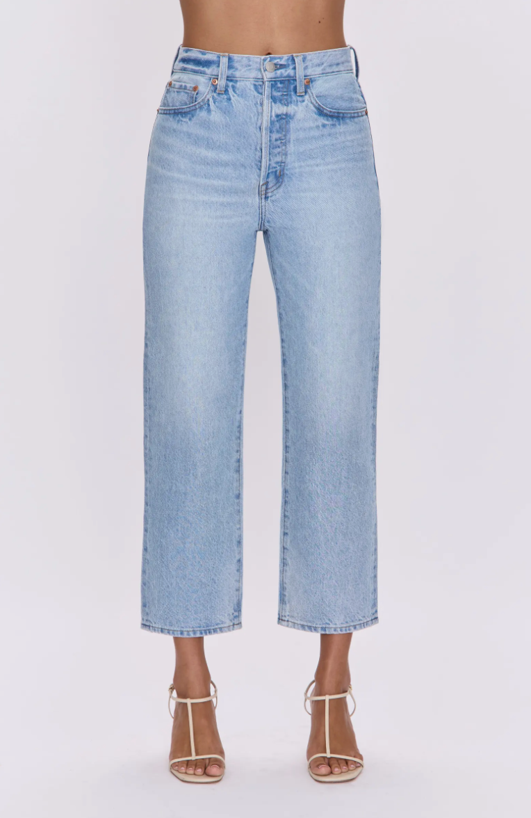 Super high rise waist with a composed straight leg silhouette, button-fly closure and cropped ankle hem. Crafted from rigid non-stretch denim for an expert fit that holds its shape. Offered in a timeless light wash with vintage inspired color fading.