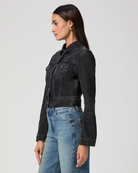 A classic denim jacket, crafted from 100% cotton in a coal black wash. This everyday layering piece is designed with a cropped fit, slanted seaming, pleated pockets, and silver buttons.