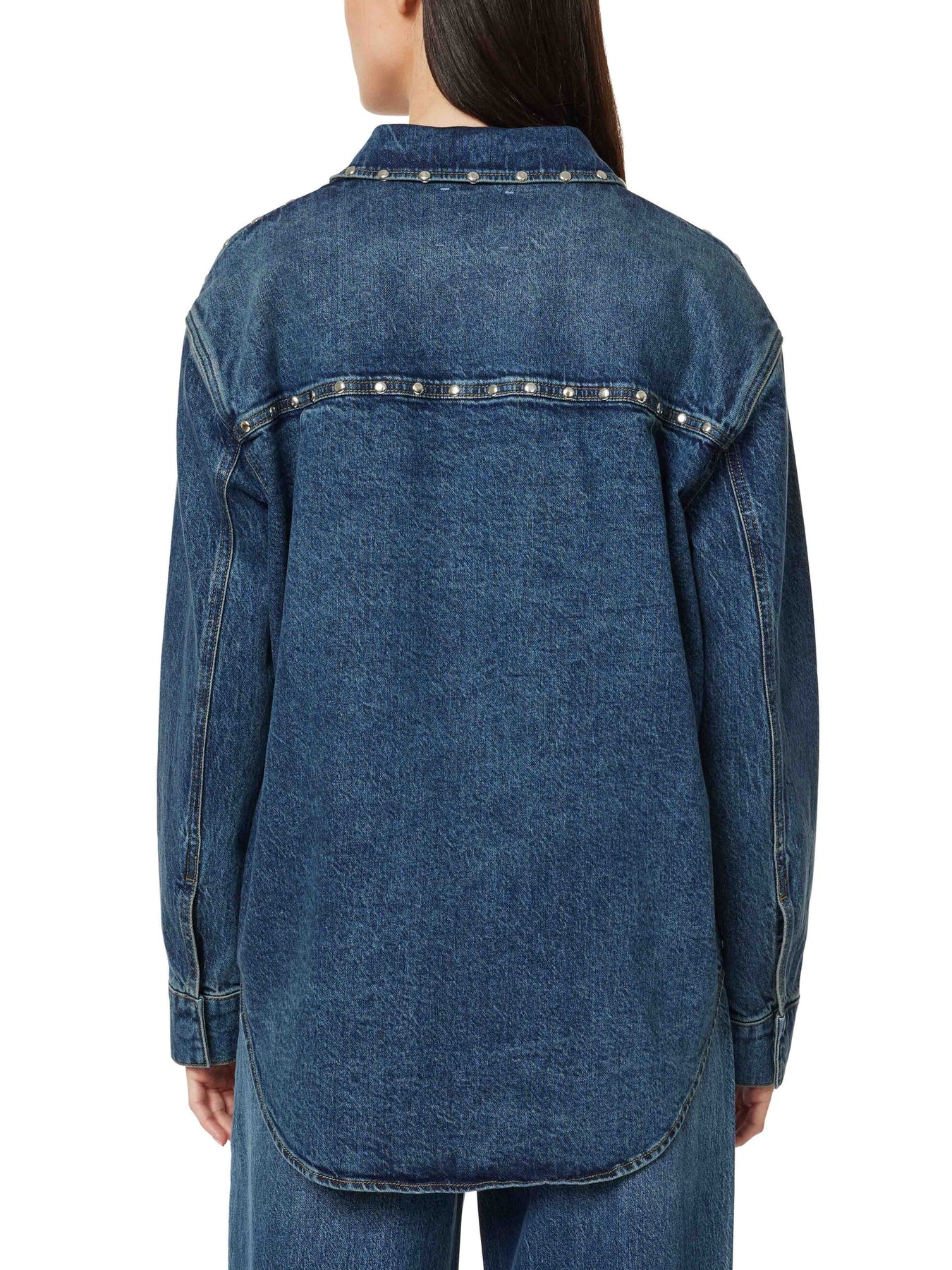 This shirt jacket turns up the volume with bold metal stud detailing and a perfectly oversized fit. Crafted from washed denim for that worn-in vibe, it’s the ultimate layer for festivals, late-night hangs, or anytime you want your outfit to do the talking.