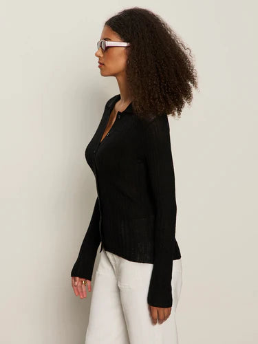 Effortlessly refined, this black cable knit cardigan combines understated elegance with everyday versatility. Crafted from lightweight, slightly sheer fabric, it features a classic button front and spread collar that elevates any ensemble. The long sleeves showcase intricate cable detailing, creating visual interest while maintaining a timeless aesthetic. Layer it over basics for polished sophistication or wear solo as a statement piece. A wardrobe essential that transcends seasons and trends.