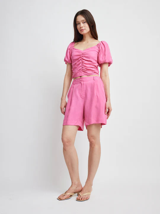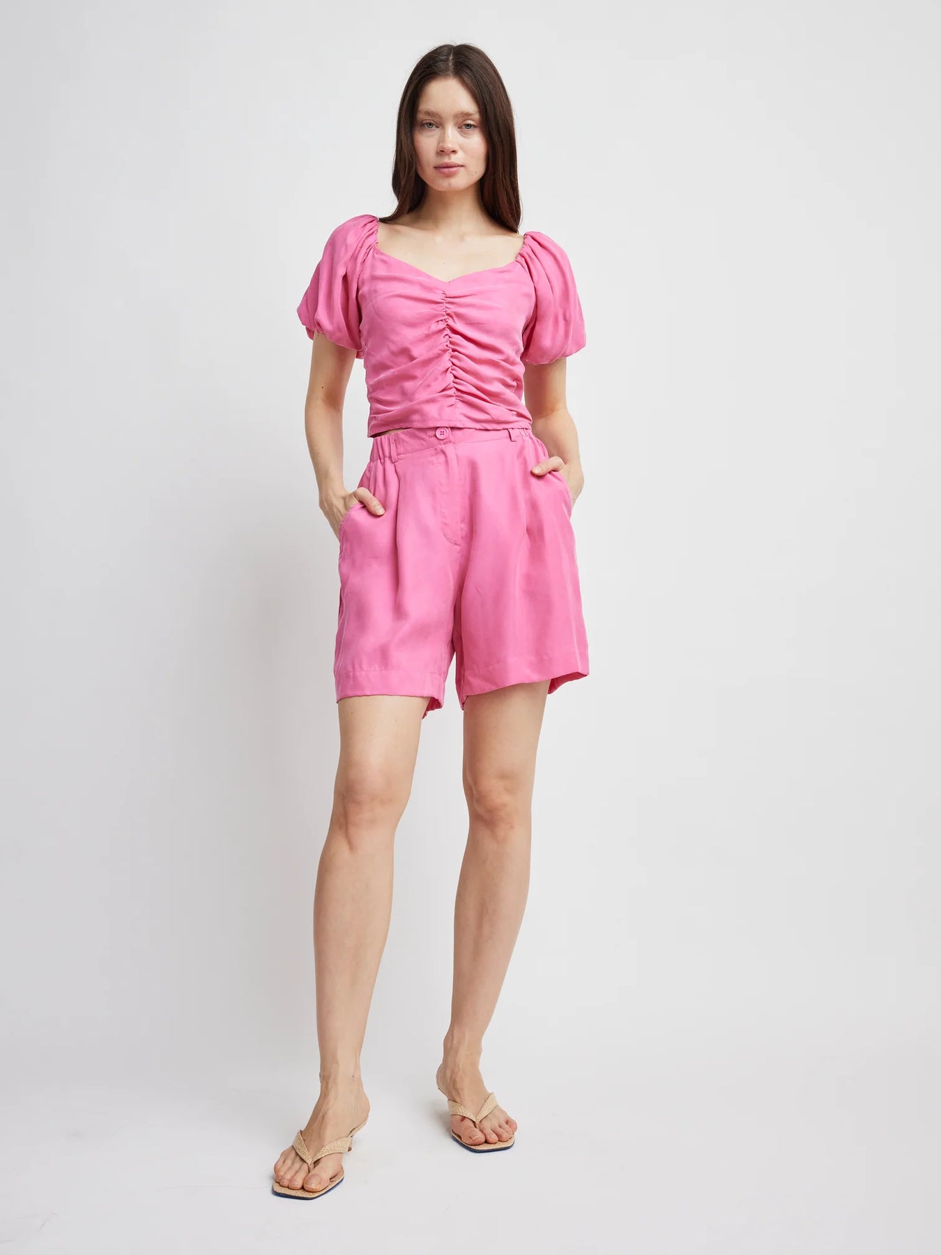 The Gabriella Ruched Top is a stylish and versatile blouse. It features prominent front ruching that offers a tailored, flattering fit and is designed to elevate both everyday and evening looks.