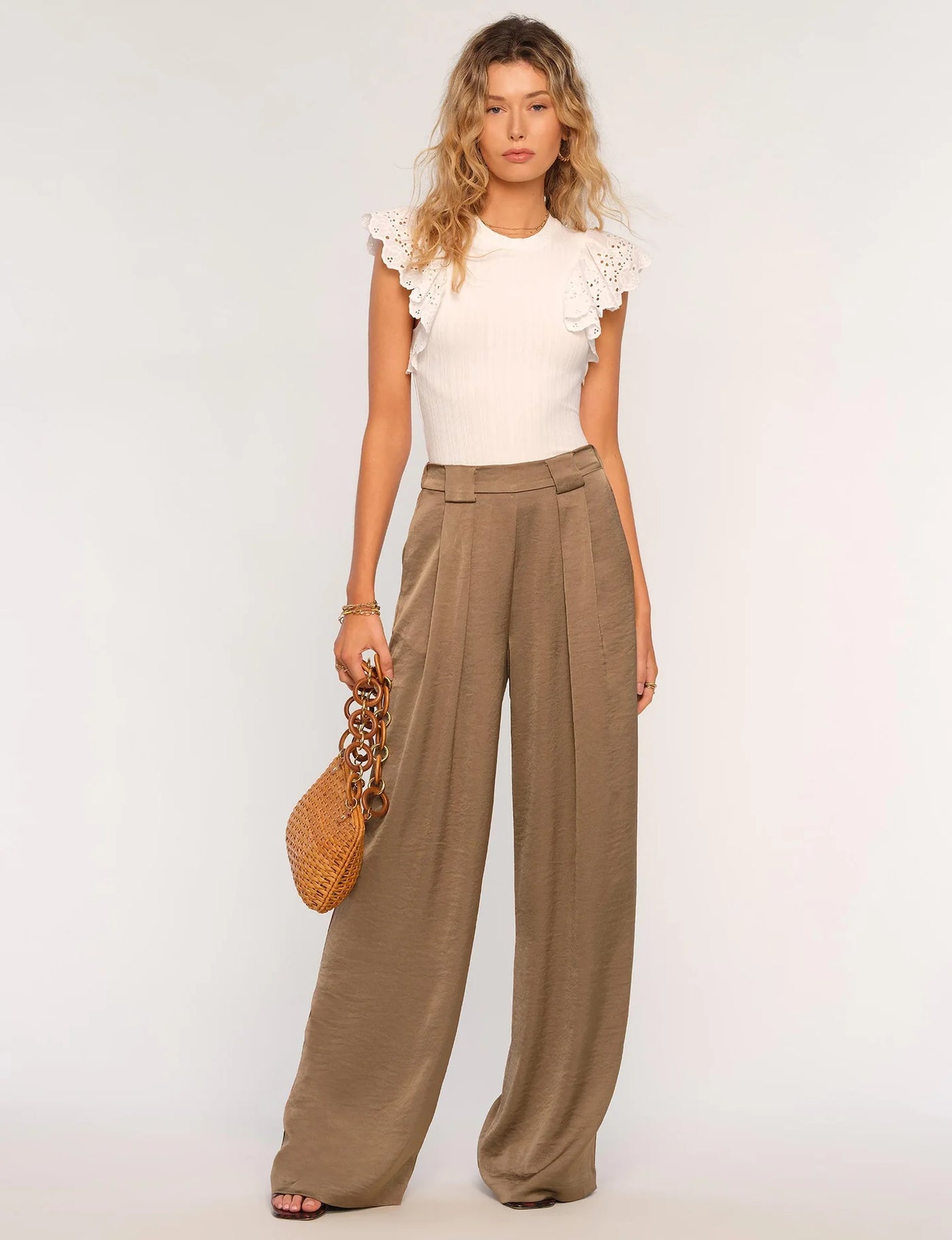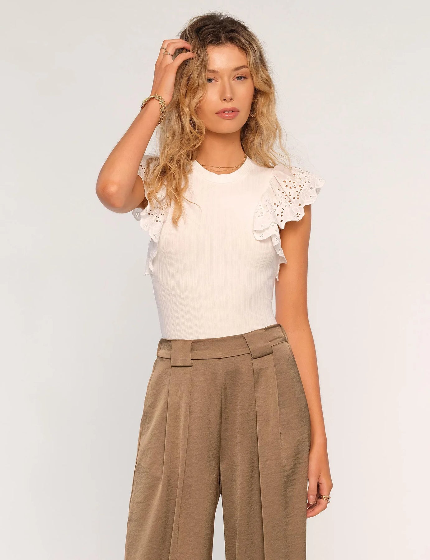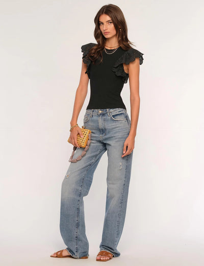 The Greta Top is a classic white tank with eyelet ruffle sleeves. It is made from a wide rib knit that’s super comfortable. Tuck it into any skirt, trouser or jean.