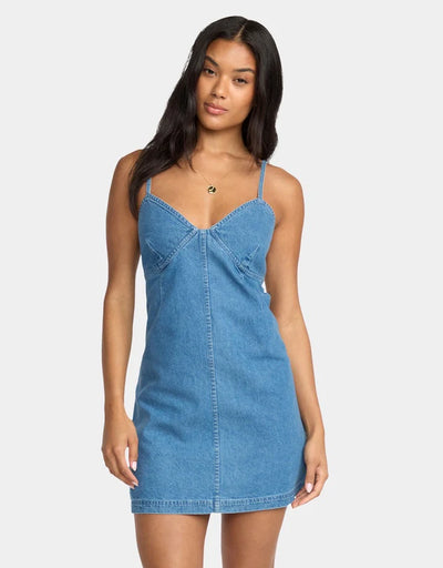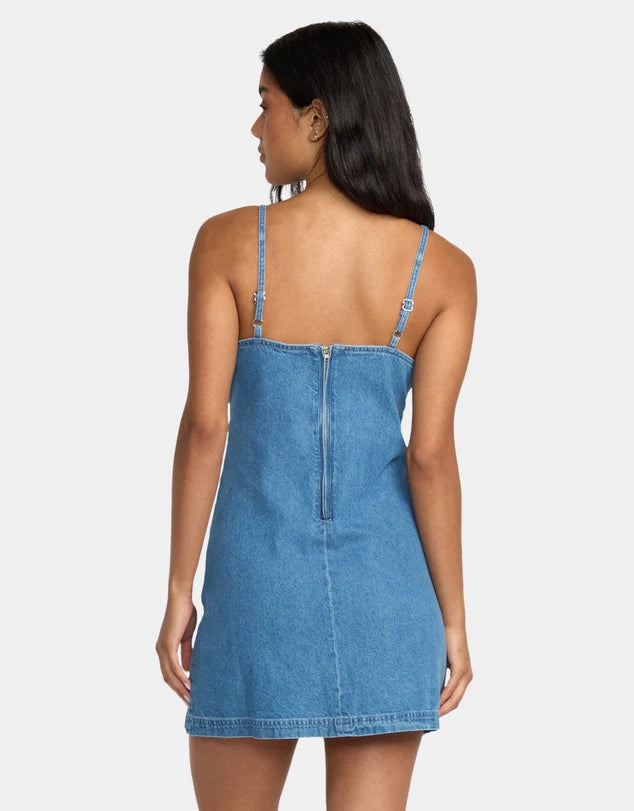 Modern minimalism meets retro appeal in this nonstretch-denim minidress designed with edgy seaming.