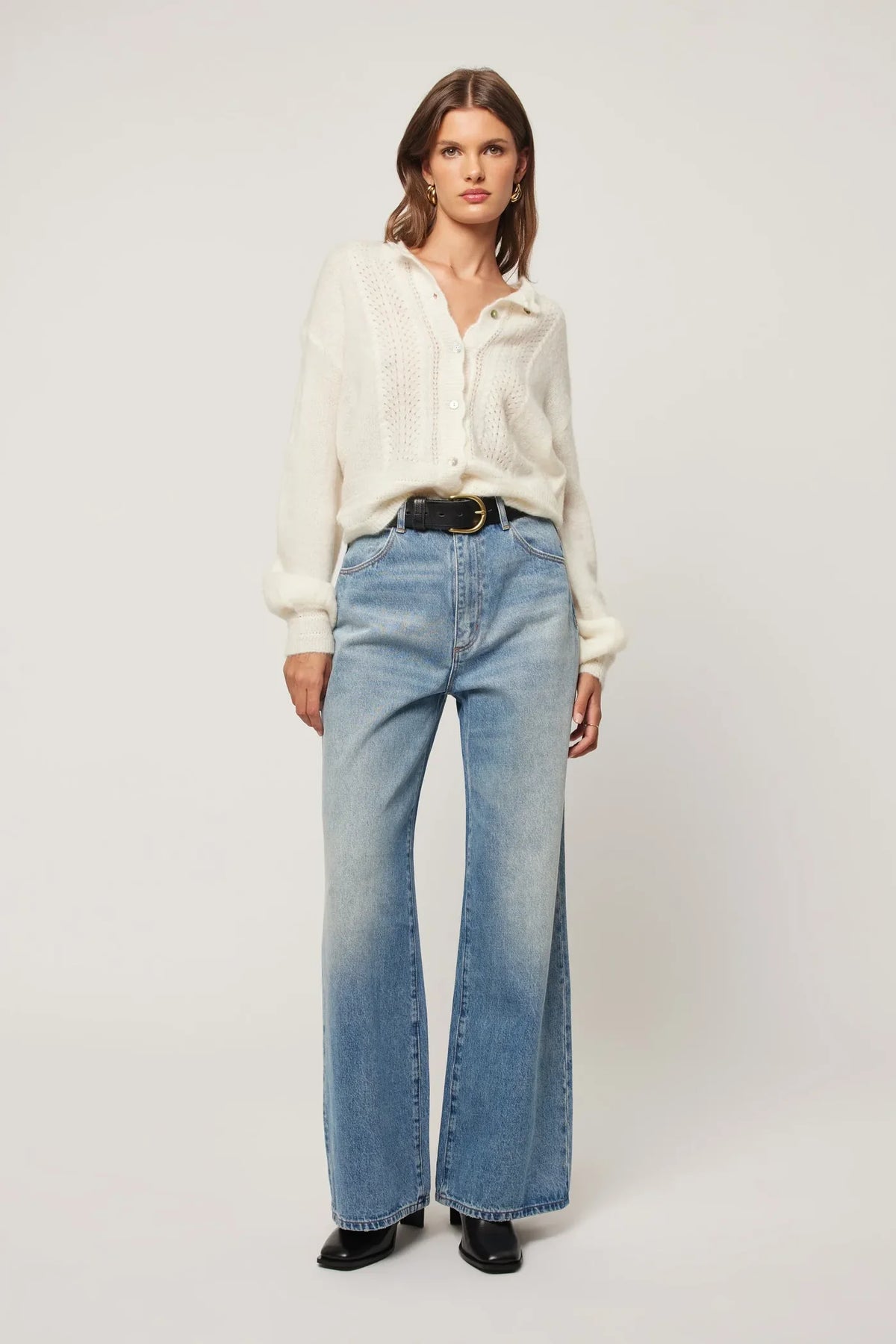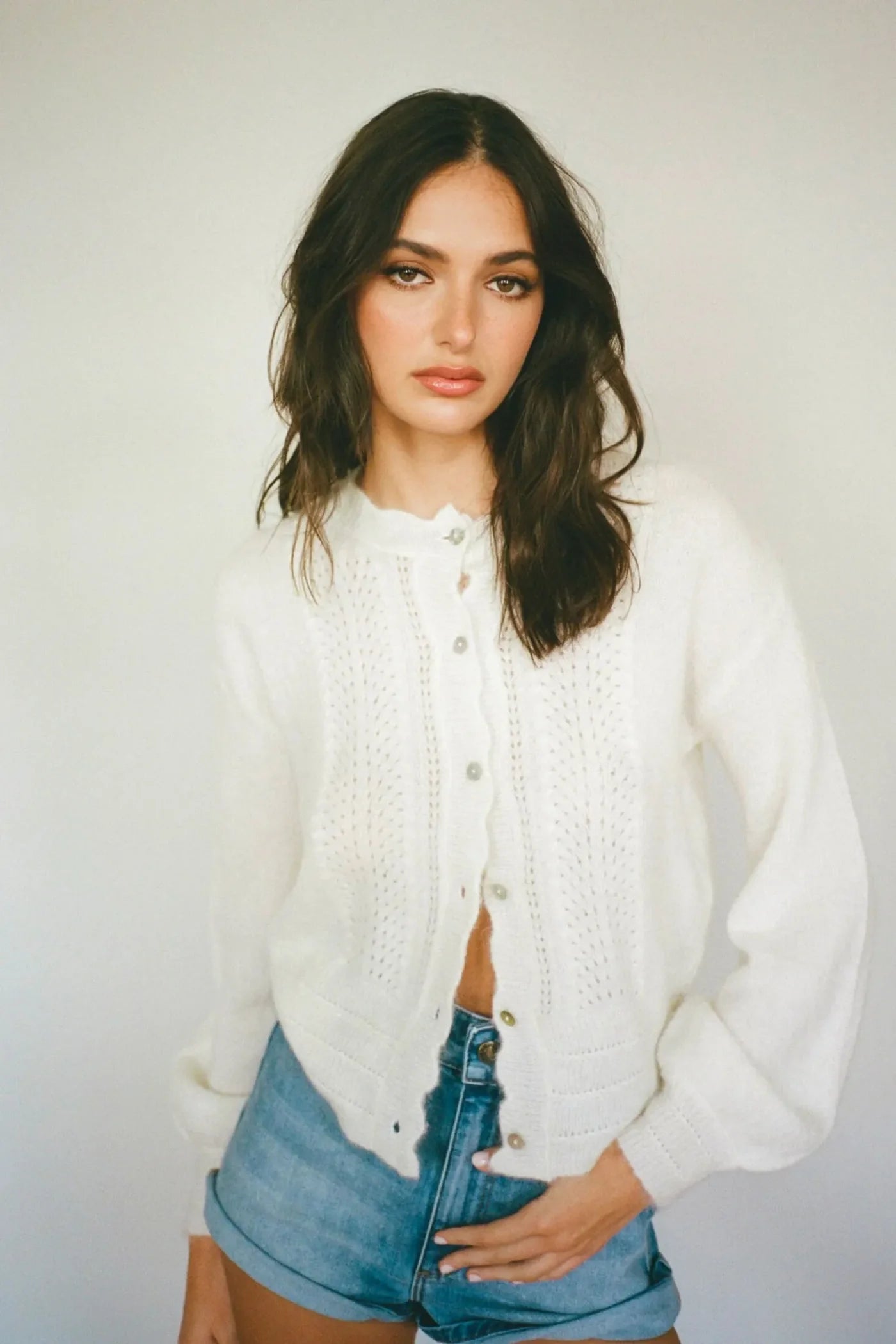 This collared cardigan features long gathered sleeves and sweet vintage-inspired lace knit panels. Designed with river shell buttons for an elegant finish, it is crafted from a soft and fluffy wool blend, ensuring warmth and comfort. Versatile in style, it can be worn tucked in for a polished look.