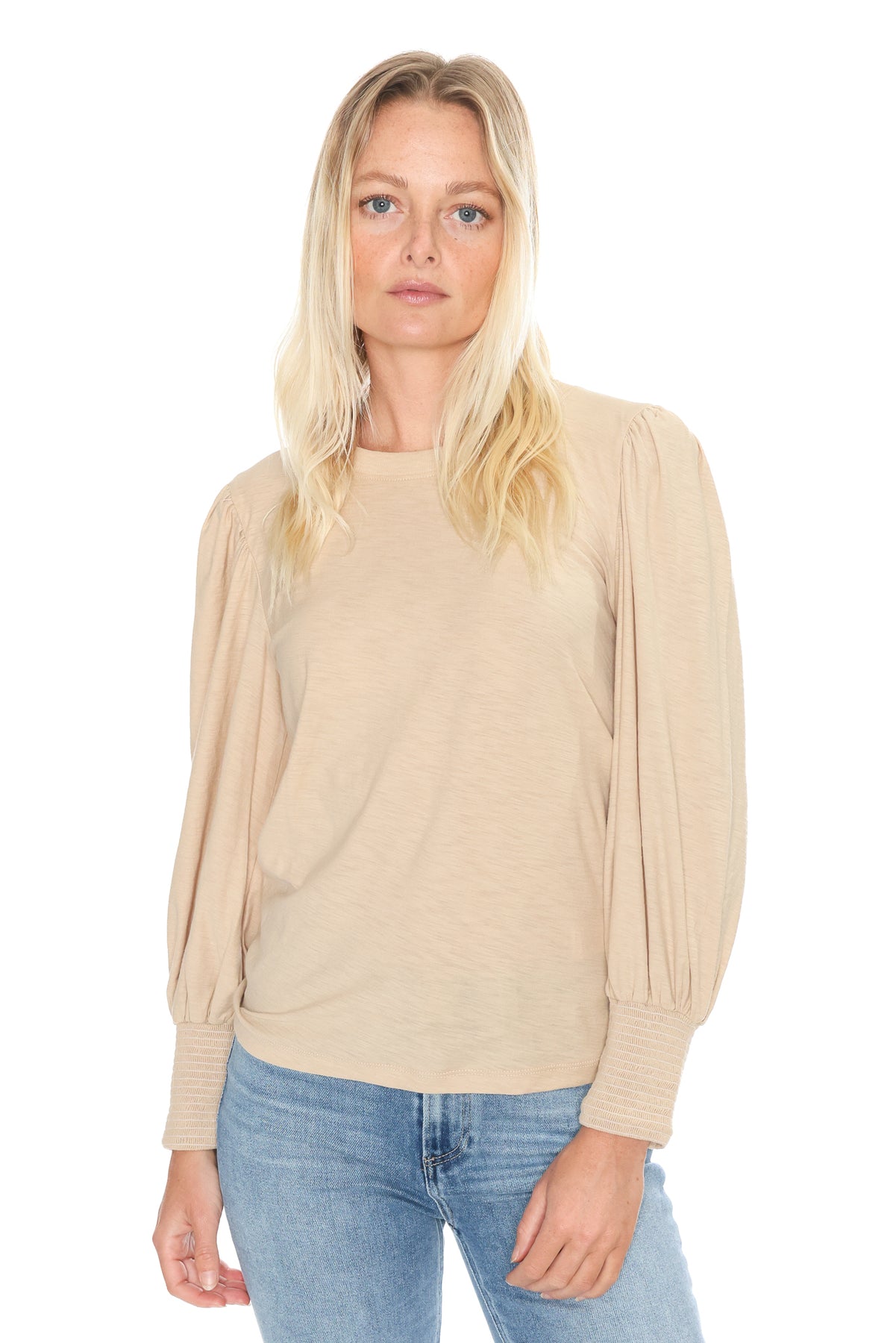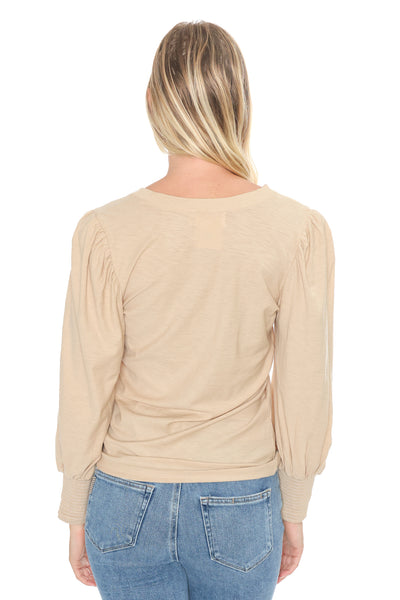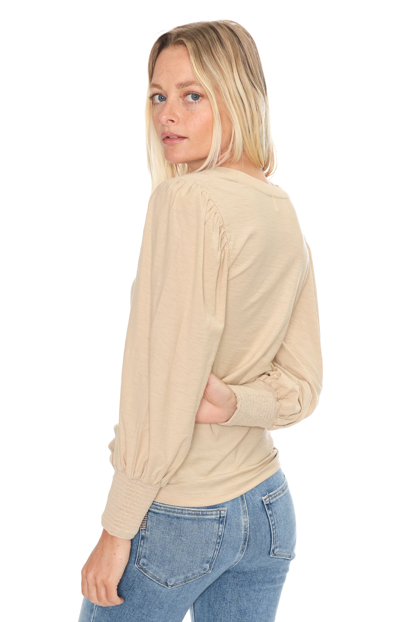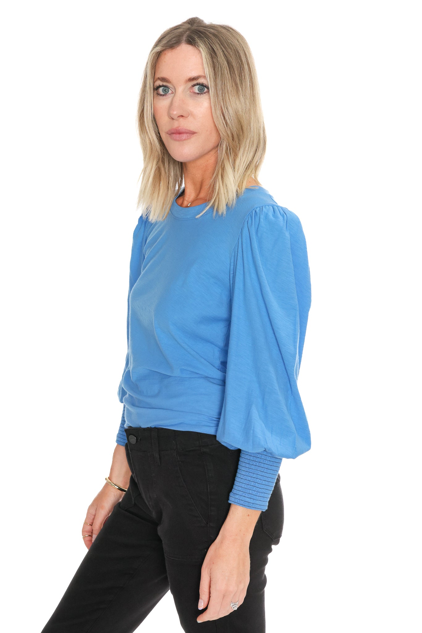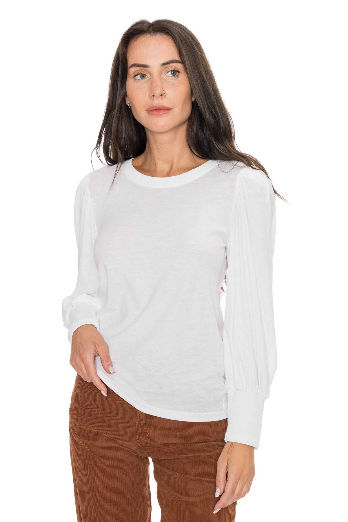 The ease of a comfortable cotton tee meets the look of a fancy blouse. An exaggerated shoulder, volume in the 3/4 length sleeve, and smocking around the cuff create a delightfully feminine look.