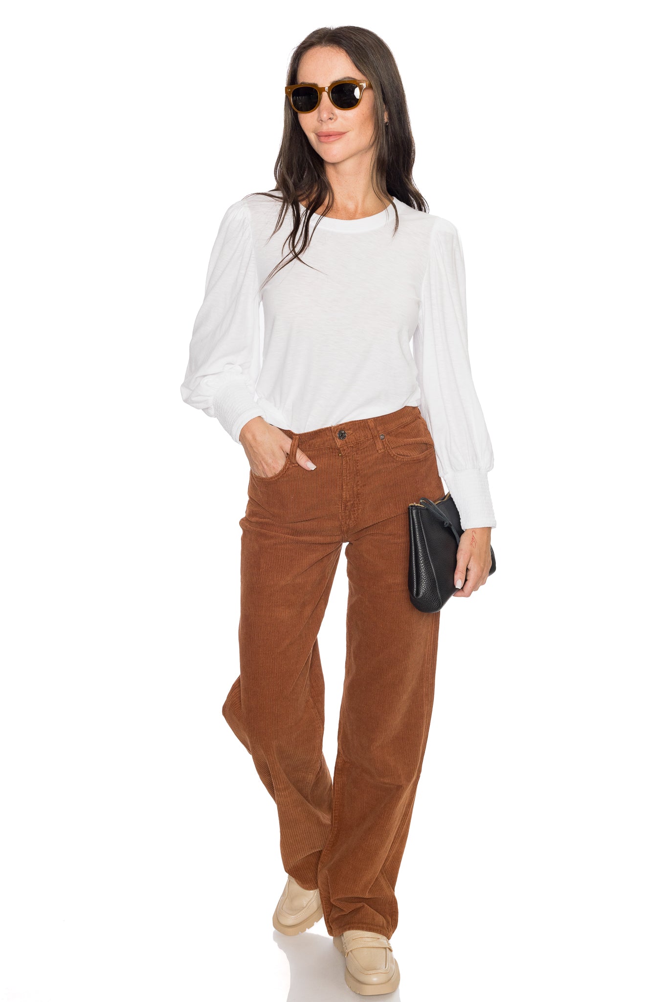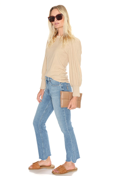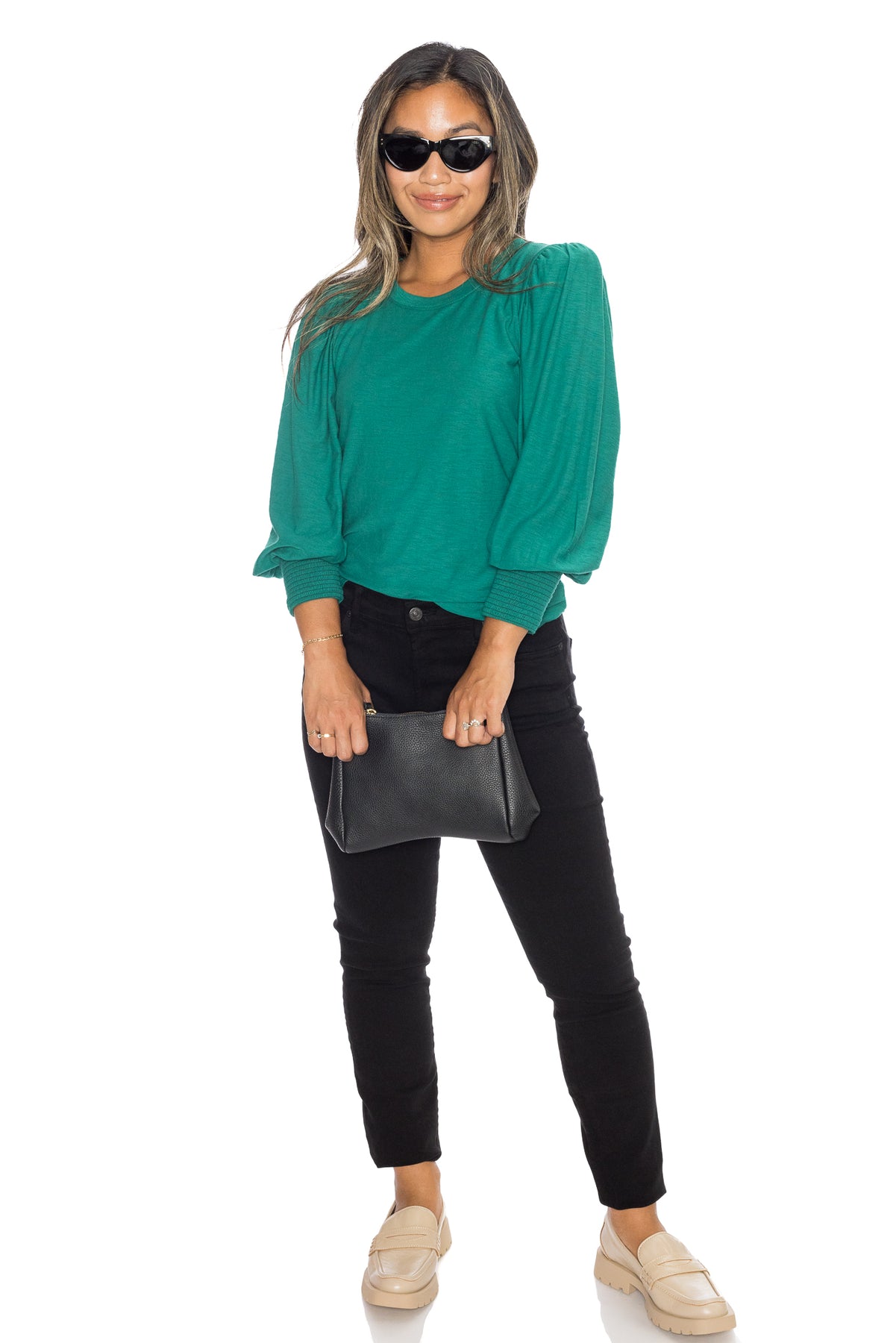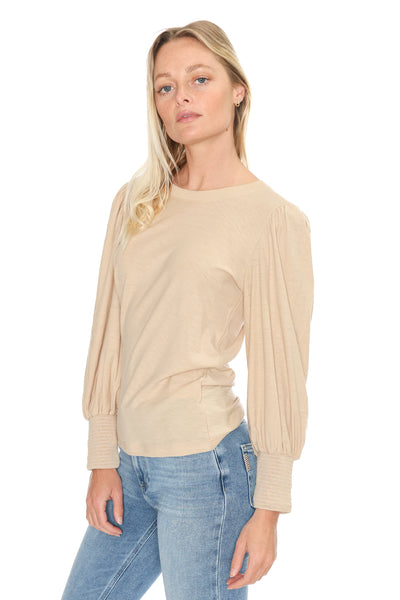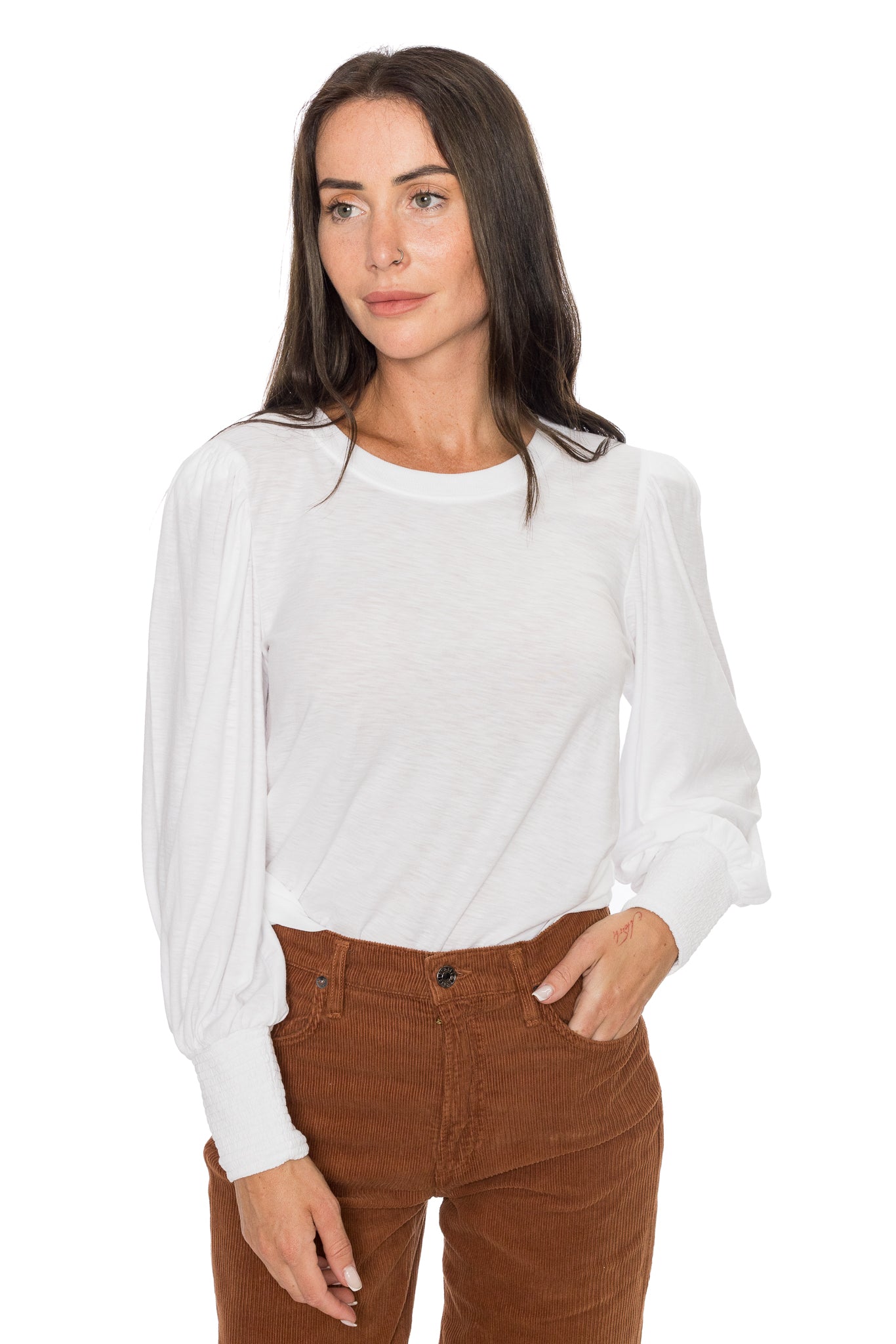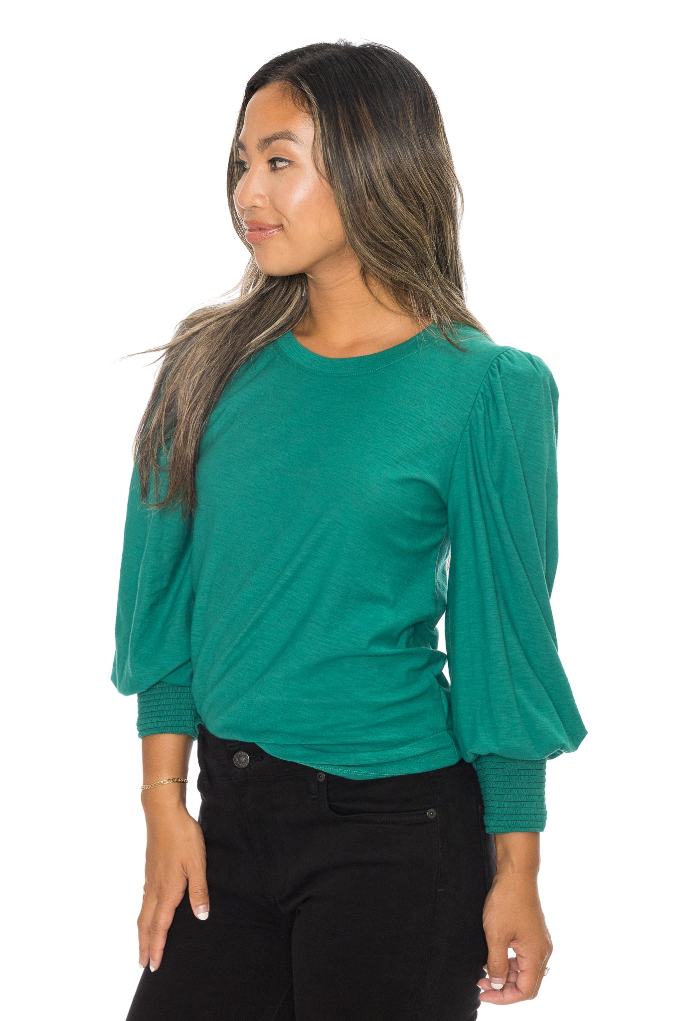 The ease of a comfortable cotton tee meets the look of a fancy blouse. An exaggerated shoulder, volume in the 3/4 length sleeve, and smocking around the cuff create a delightfully feminine look.