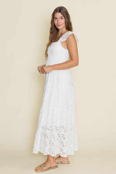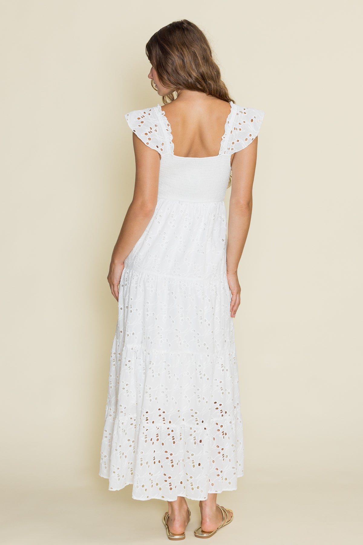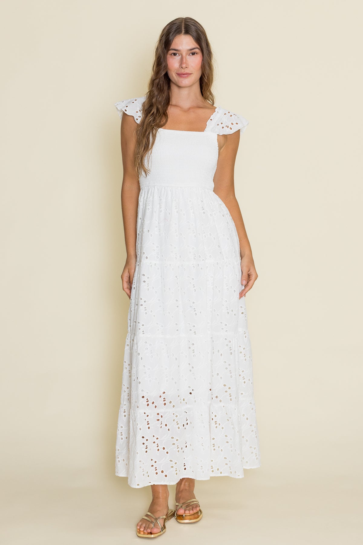 Ultra-romantic and effortlessly refined, this embroidered eyelet maxi dress features a smocked bodice and square neckline for a flattering, feminine fit. Short flutter sleeves lend a flirty finish, while the flowy tiered silhouette adds effortless grace. A beautiful choice for warm-weather celebrations or an unforgettable bridal moment.