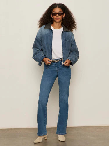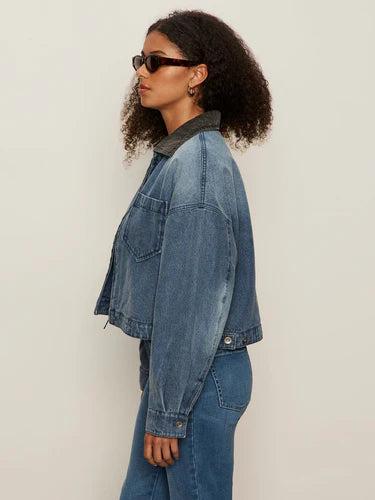 The perfect layer for chilly days, this faded cotton-denim jacket is cut in a boxy, cropped silhouette and warmed by soft faux-shearling lining.