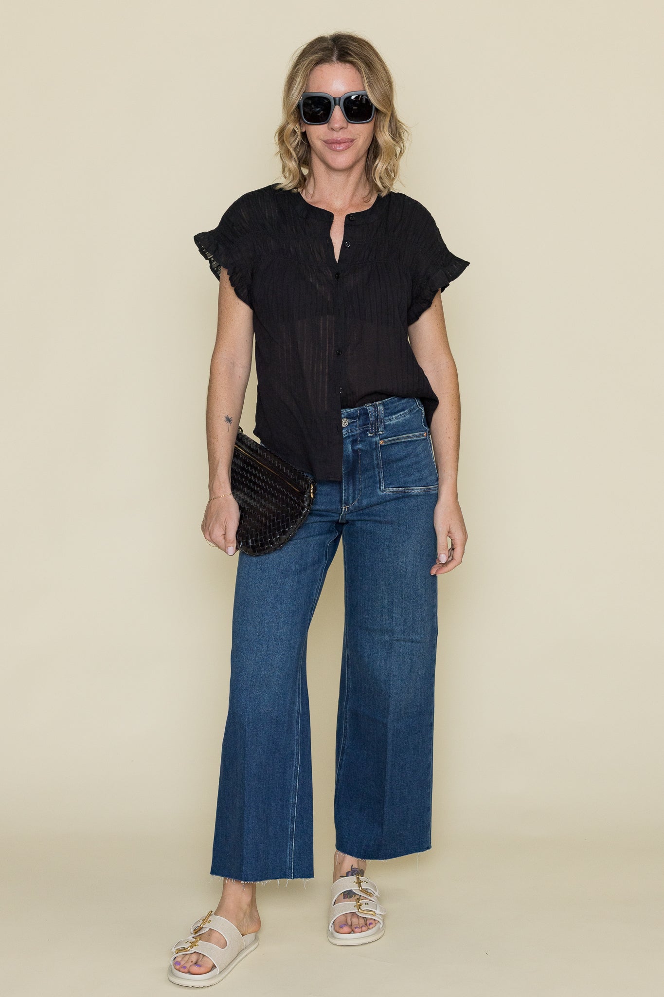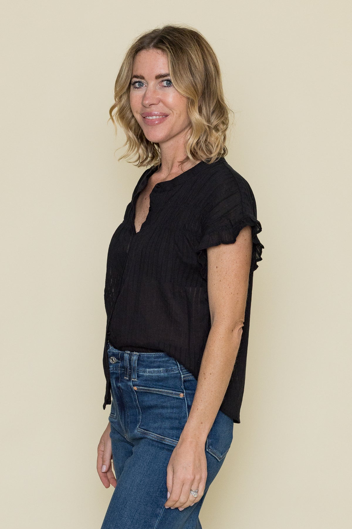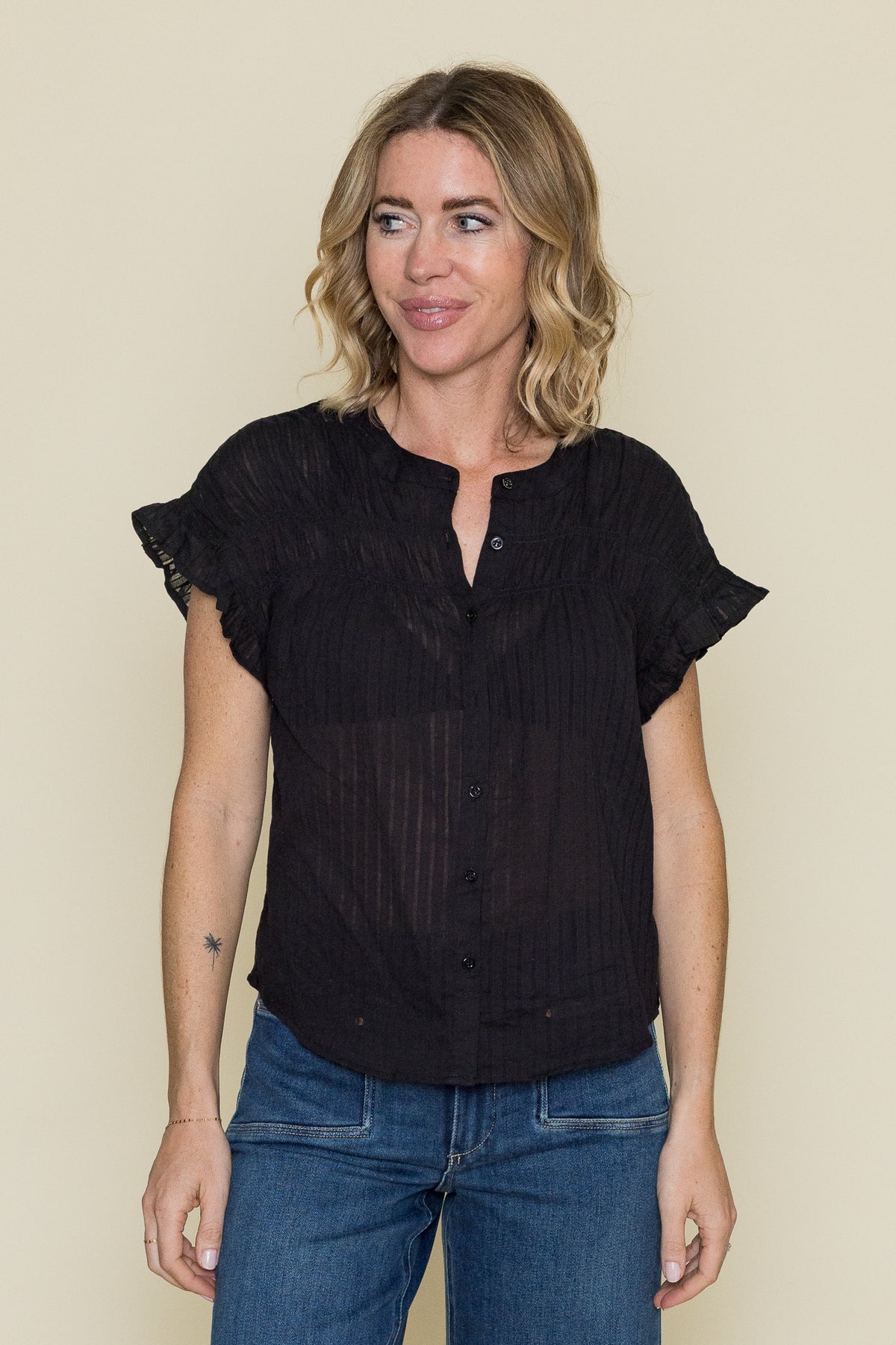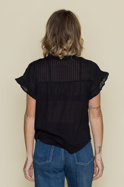 The Saleh Blouse will have jaws dropping. This blouse features smocked detailing and ruffle trim. Style with a denim mini skirt and black knee-high boots.