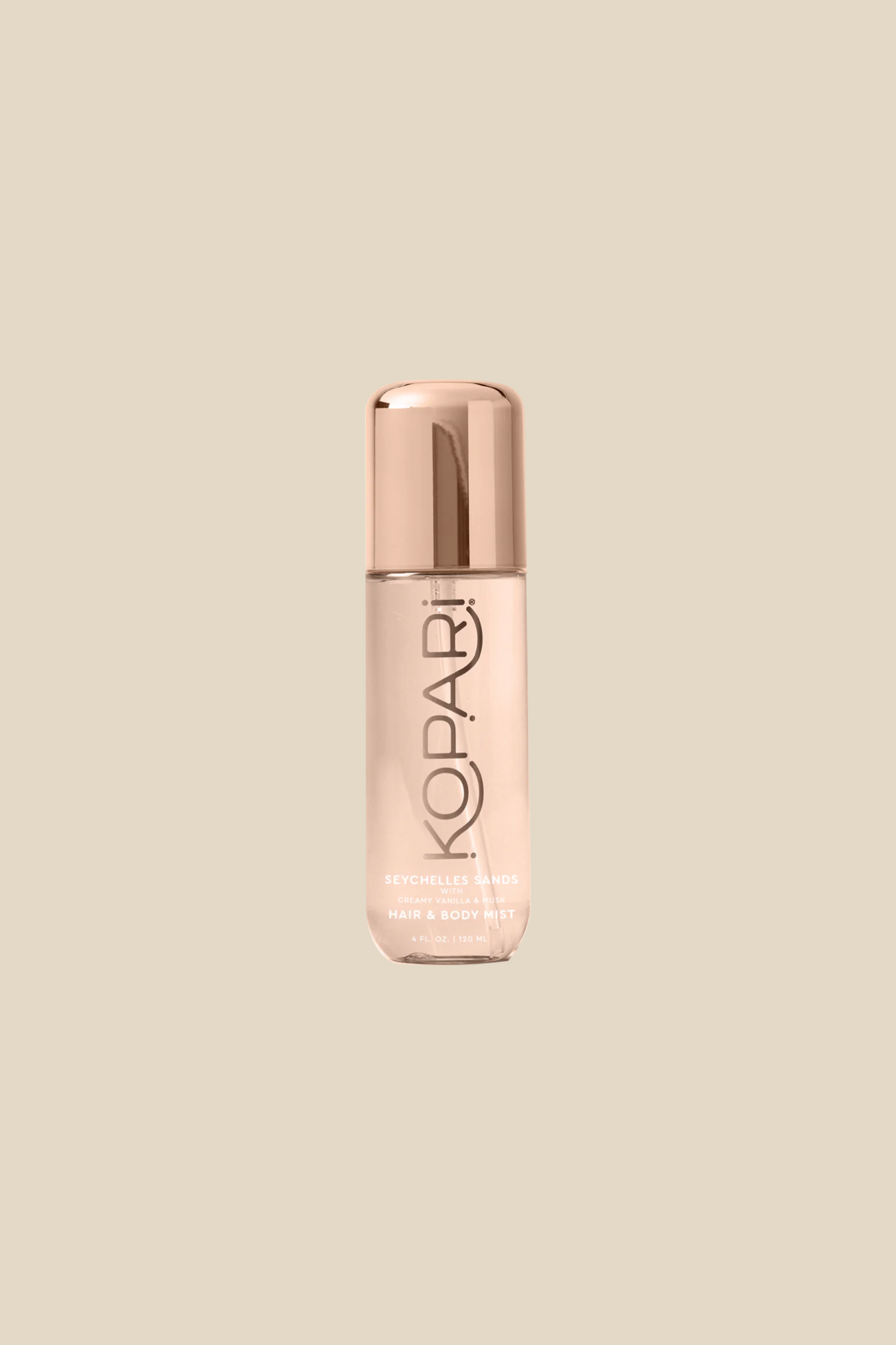 along a private beach kissed a lingering summer sunset with Kopari's Seychelles Sands Hair & Body Mist. This seductive, musky fragrance is a warm blend of creamy vanilla and spice.