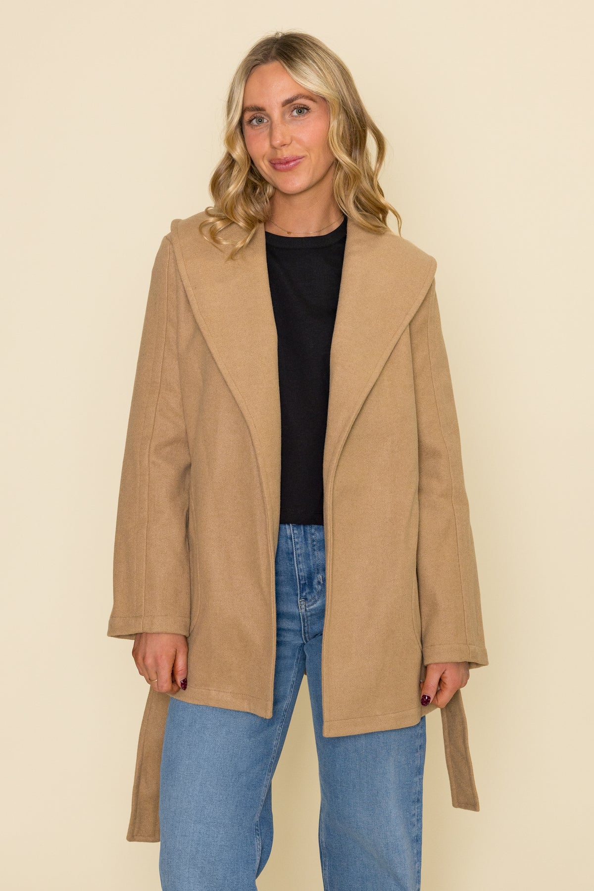 This shawl belted coat is the perfect way to dress up any everyday look. Tie at the waist to accent your shape and elevate your look!