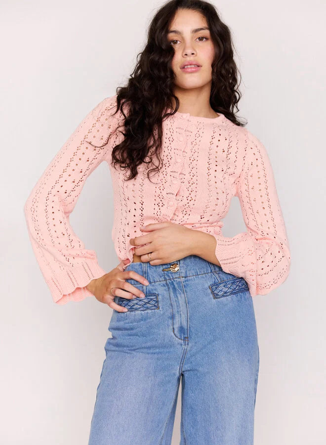 The Sienna Pointelle Cardigan is a soft, feminine layering piece designed for effortless everyday wear. Featuring a delicate pointelle knit and classic button-through front, this lightweight cardigan is perfect worn on its own or layered over simple basics.