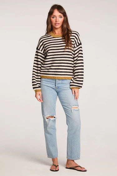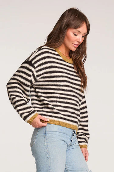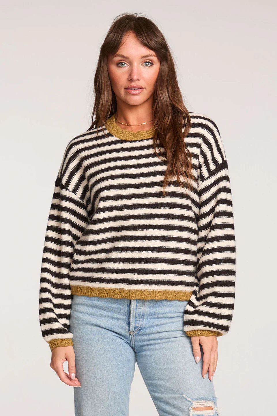 The Steevie Black and White Sweater is a sophisticated staple featuring a high neckline, iconic black and white stripes, and dramatic gigot sleeves.